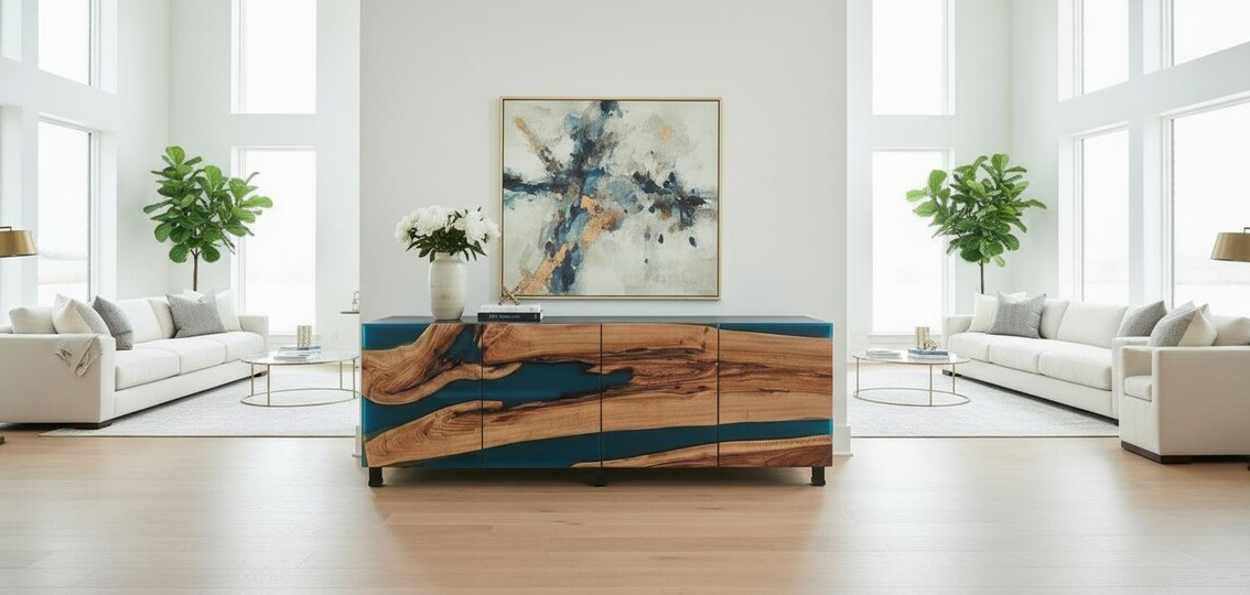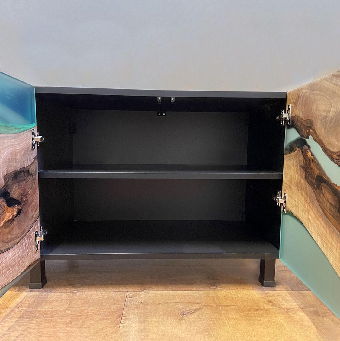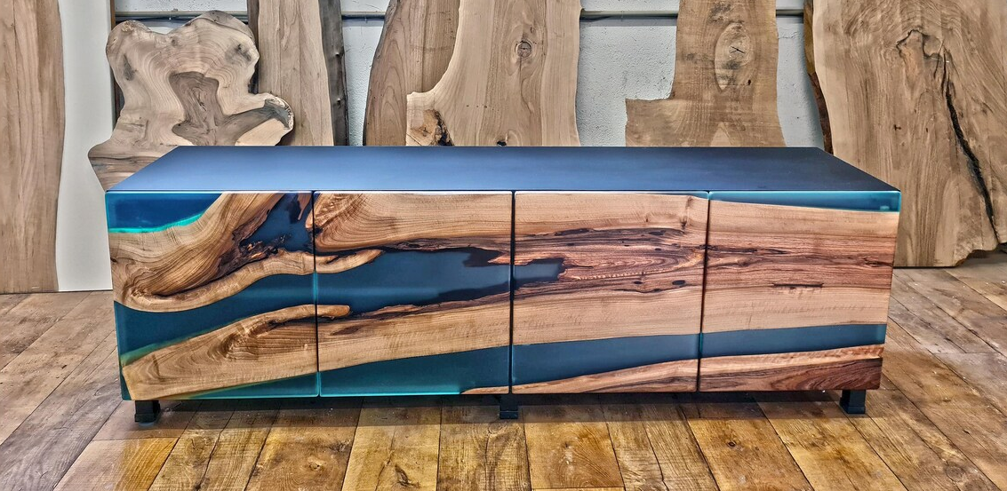 Уникальный акцент: Бирюзовая смола искусно заполняет природные сучки дерева, подчеркивая его неповторимую текстуру.