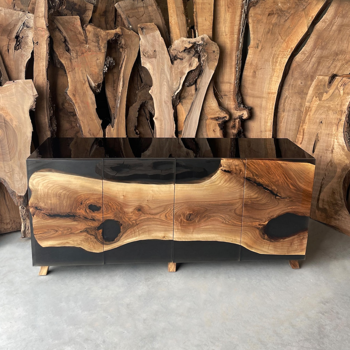 Безупречный контраст: Естественные особенности ореха подчеркнуты черной эпоксидной заливкой, что гарантирует уникальность каждого фасада и долговечность конструкции.