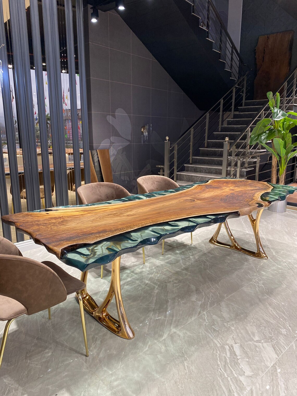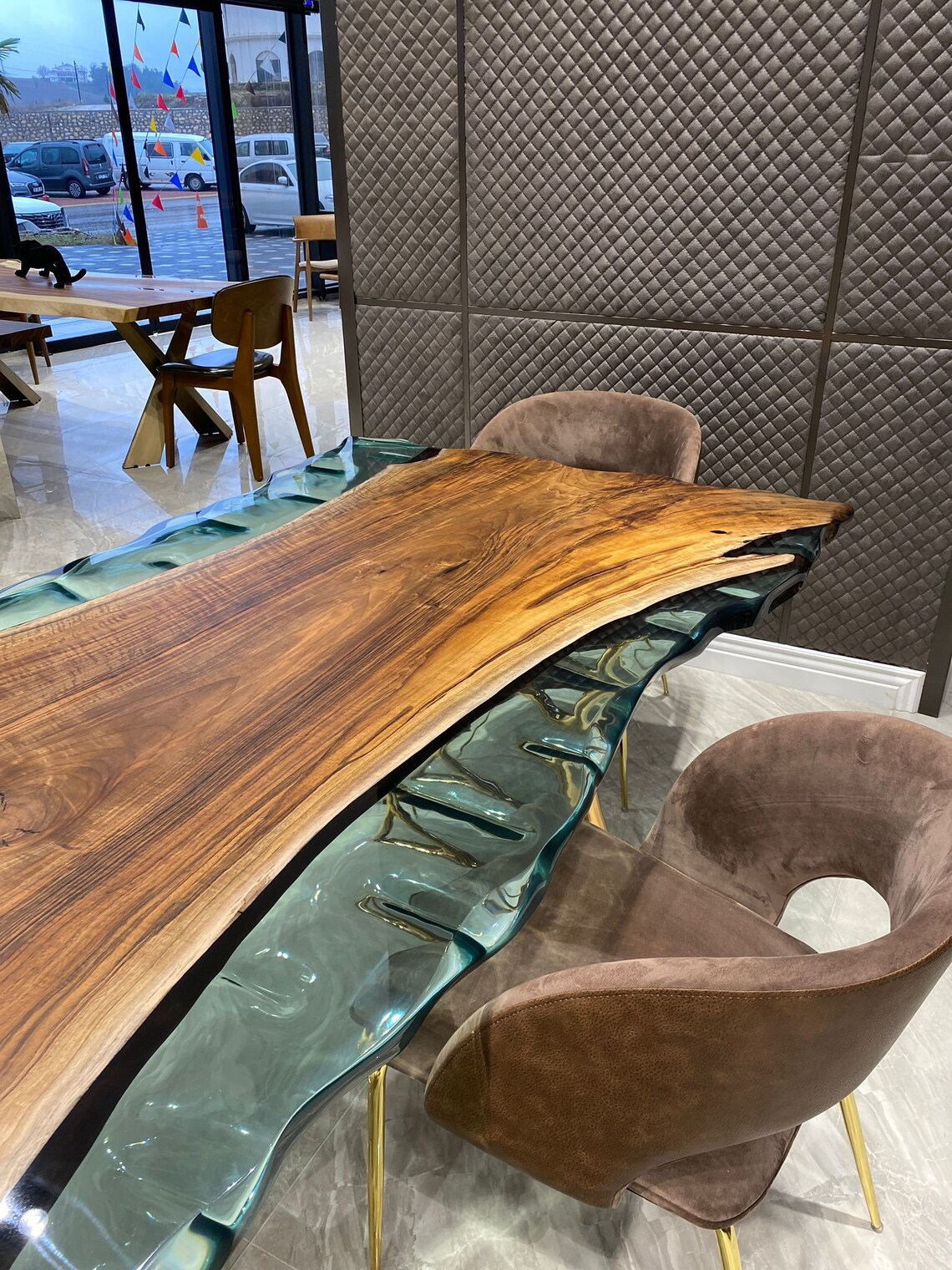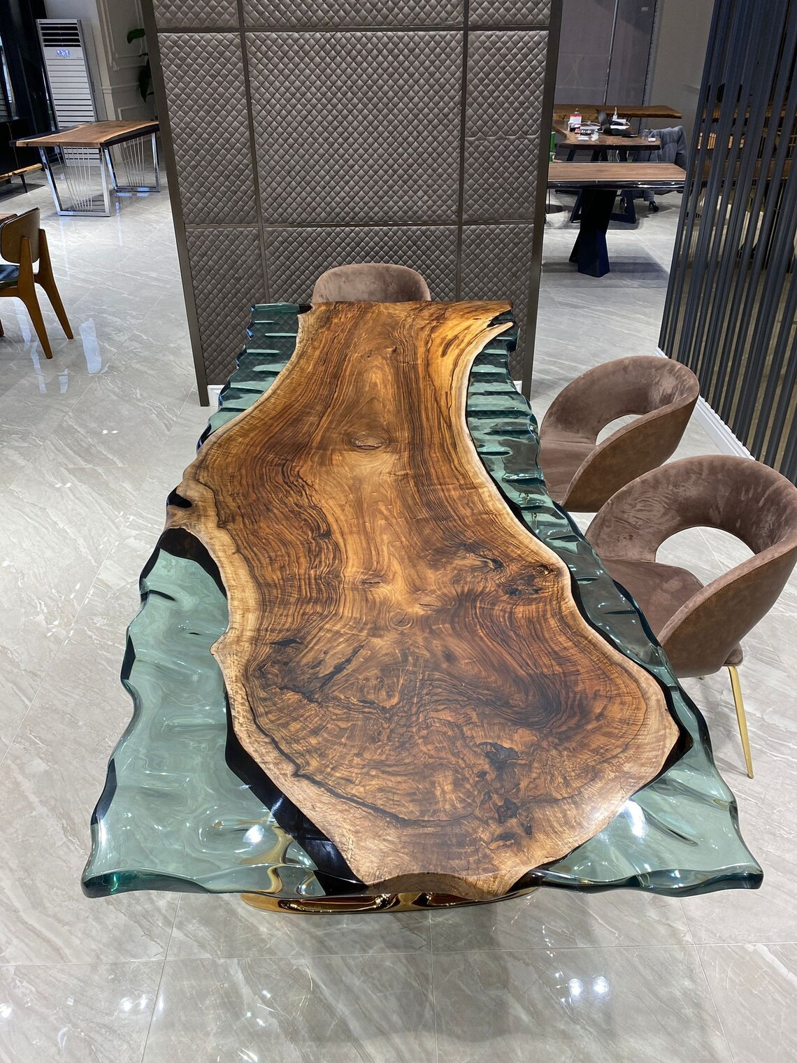 Что делает этот стол по-настоящему необычным, кроется под ним: тщательно вырезанное вручную русло реки, протекающее под кристально чистой эпоксидной смолой — редкий штрих ремесленного искусства, доступный только взыскательному глазу.