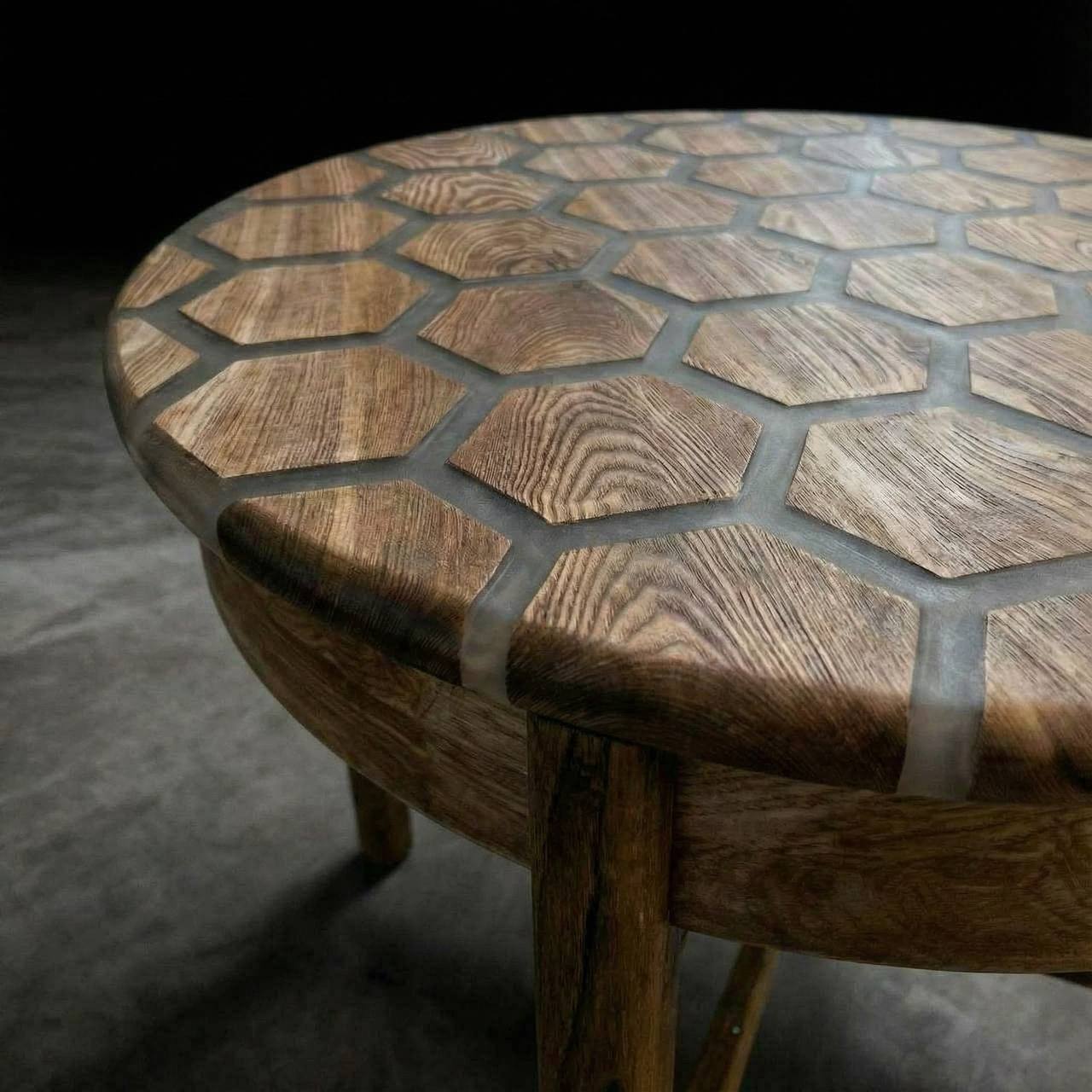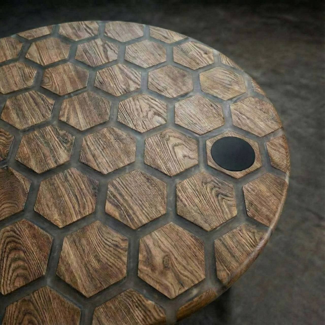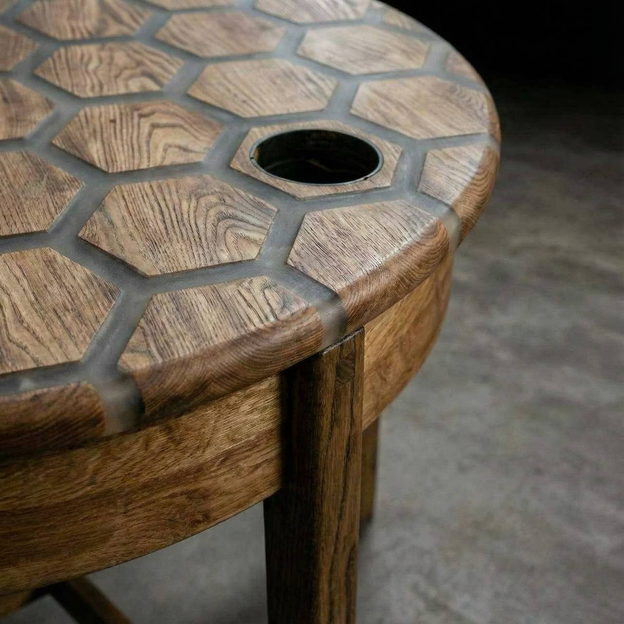 Перед вами не просто стол, а высокотехнологичный арт-объект, созданный удивлять. Стильная столешница в форме идеального круга (Ø140 см) собрана из премиальных слэбов карагача и гексагональных элементов, залитых прозрачной эпоксидной смолой.