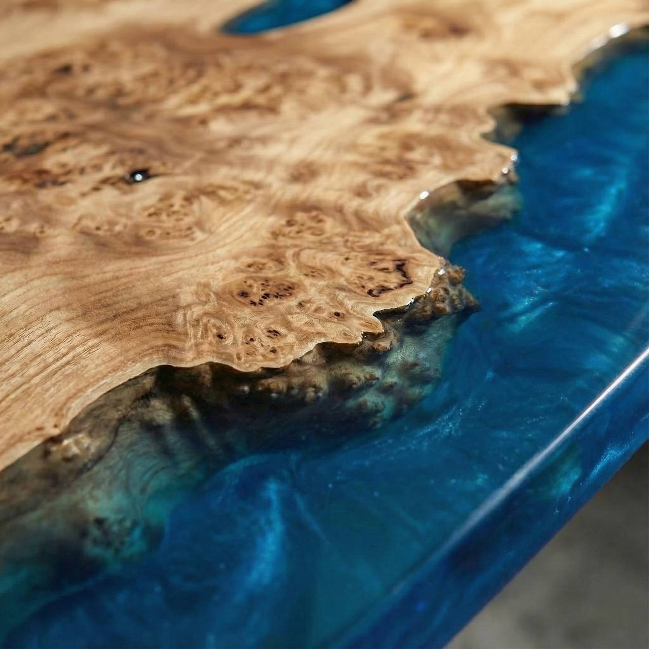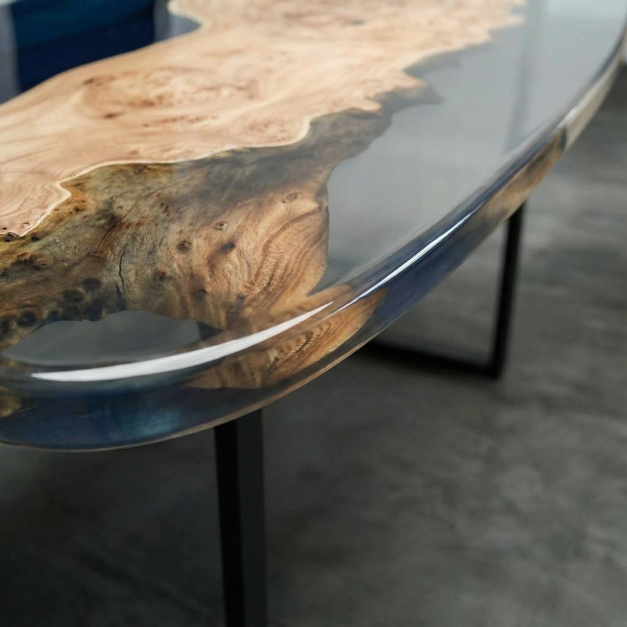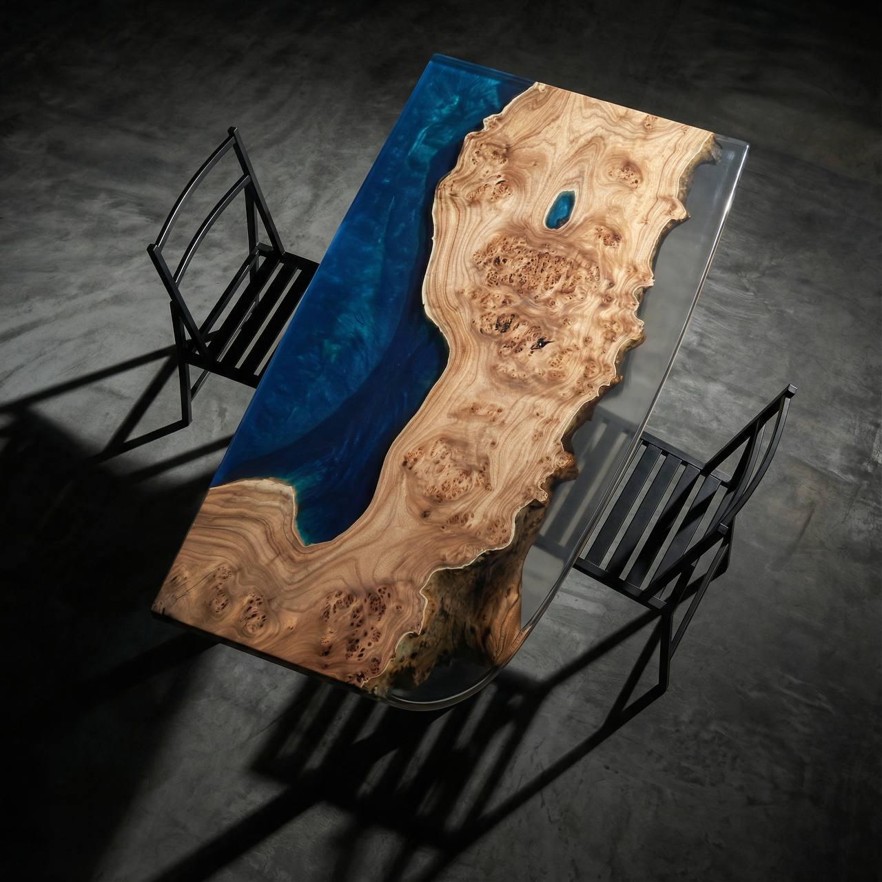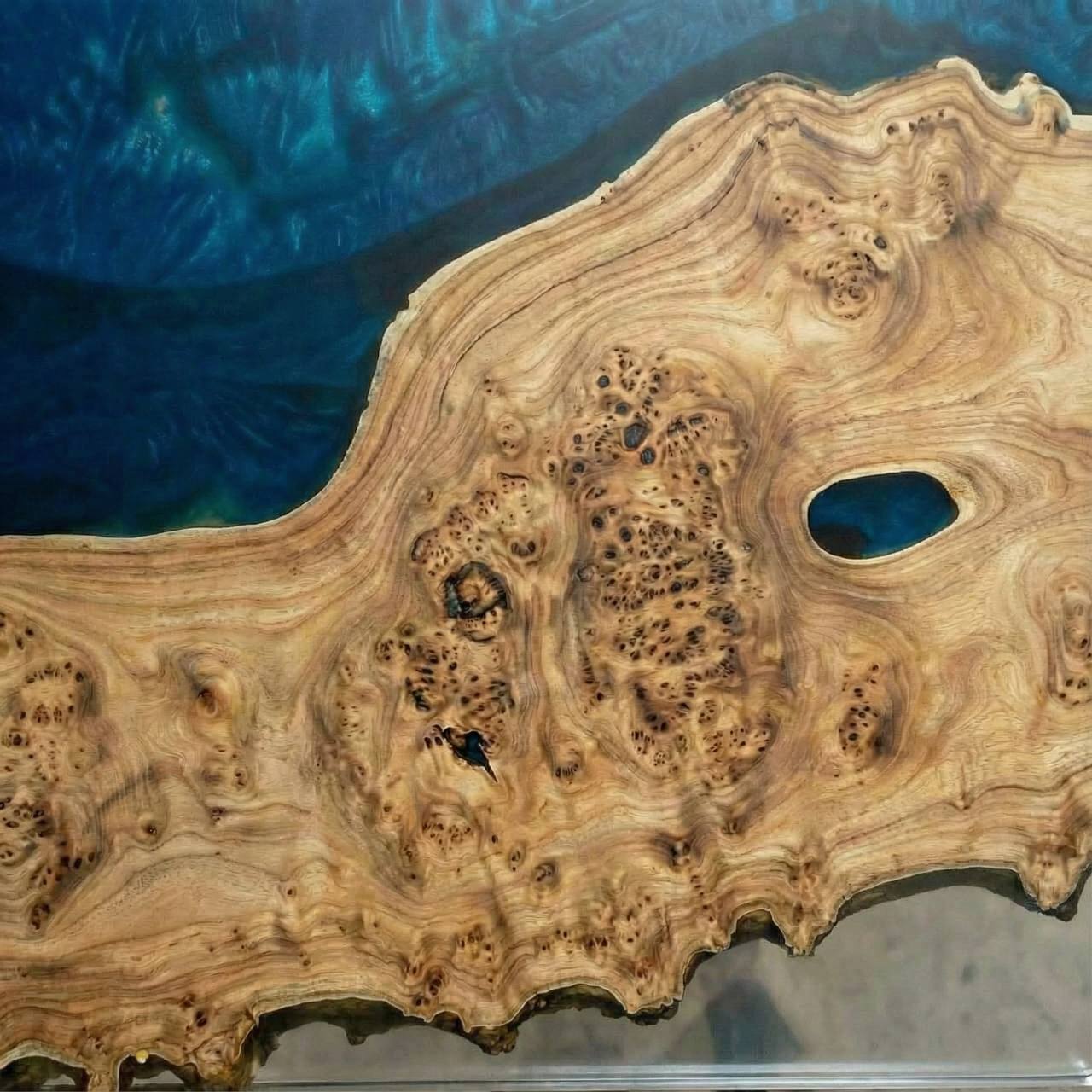 Главная «изюминка» модели — двойное исполнение. Одна сторона стола залита насыщенным синим цветом, напоминающим глубокое ночное море, что делает текстуру дерева объемной и загадочной. Перевернув стол, вы получаете абсолютно прозрачную поверхность, позволяющую рассмотреть каждый изгиб и сучок карагача в мельчайших деталях. Это два разных настроения в одном предмете мебели.