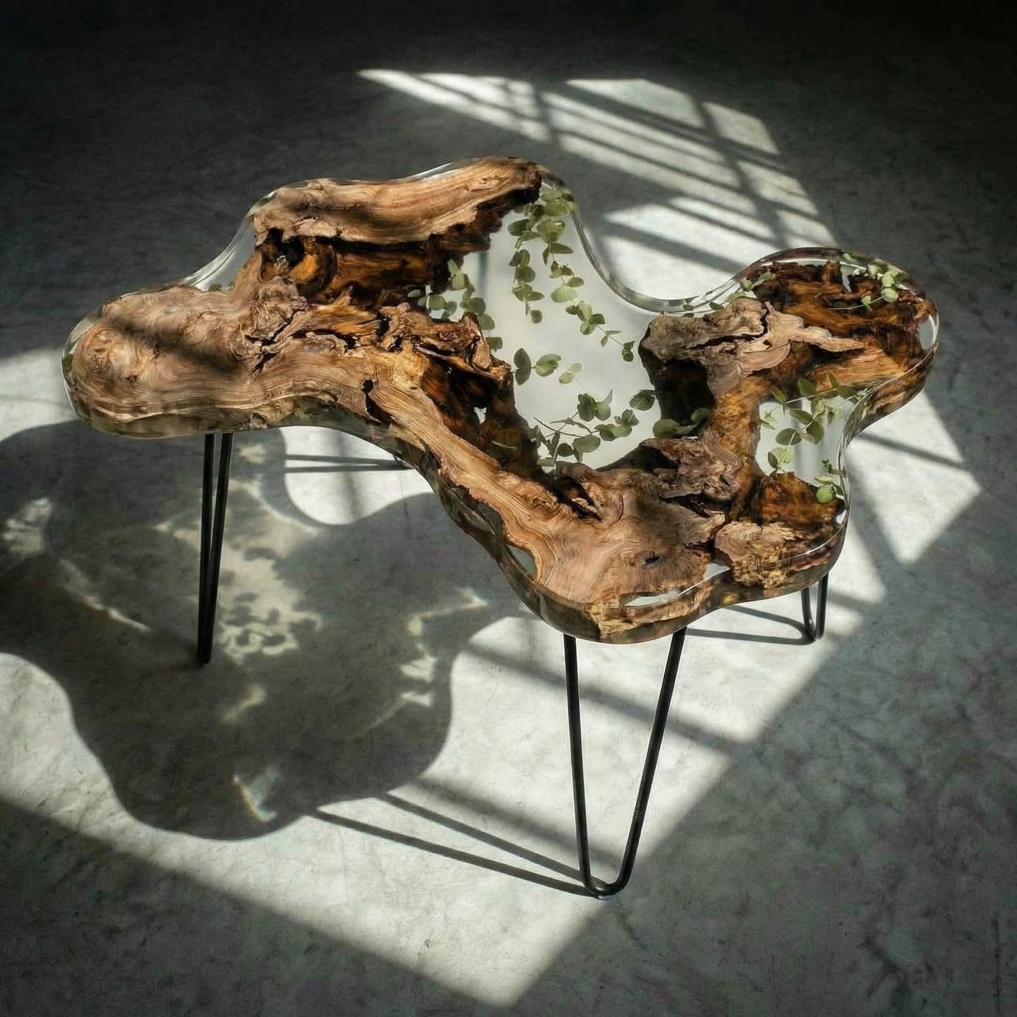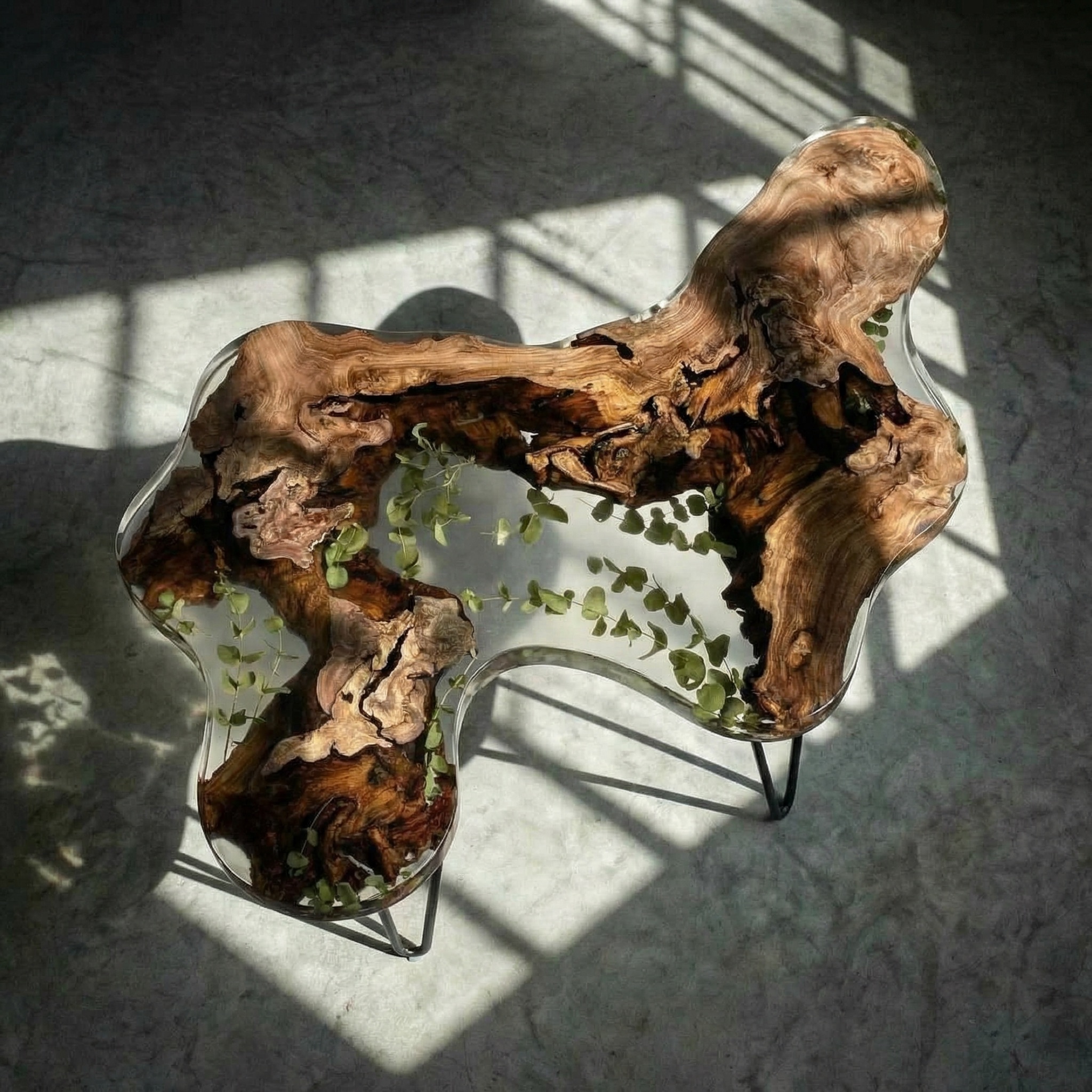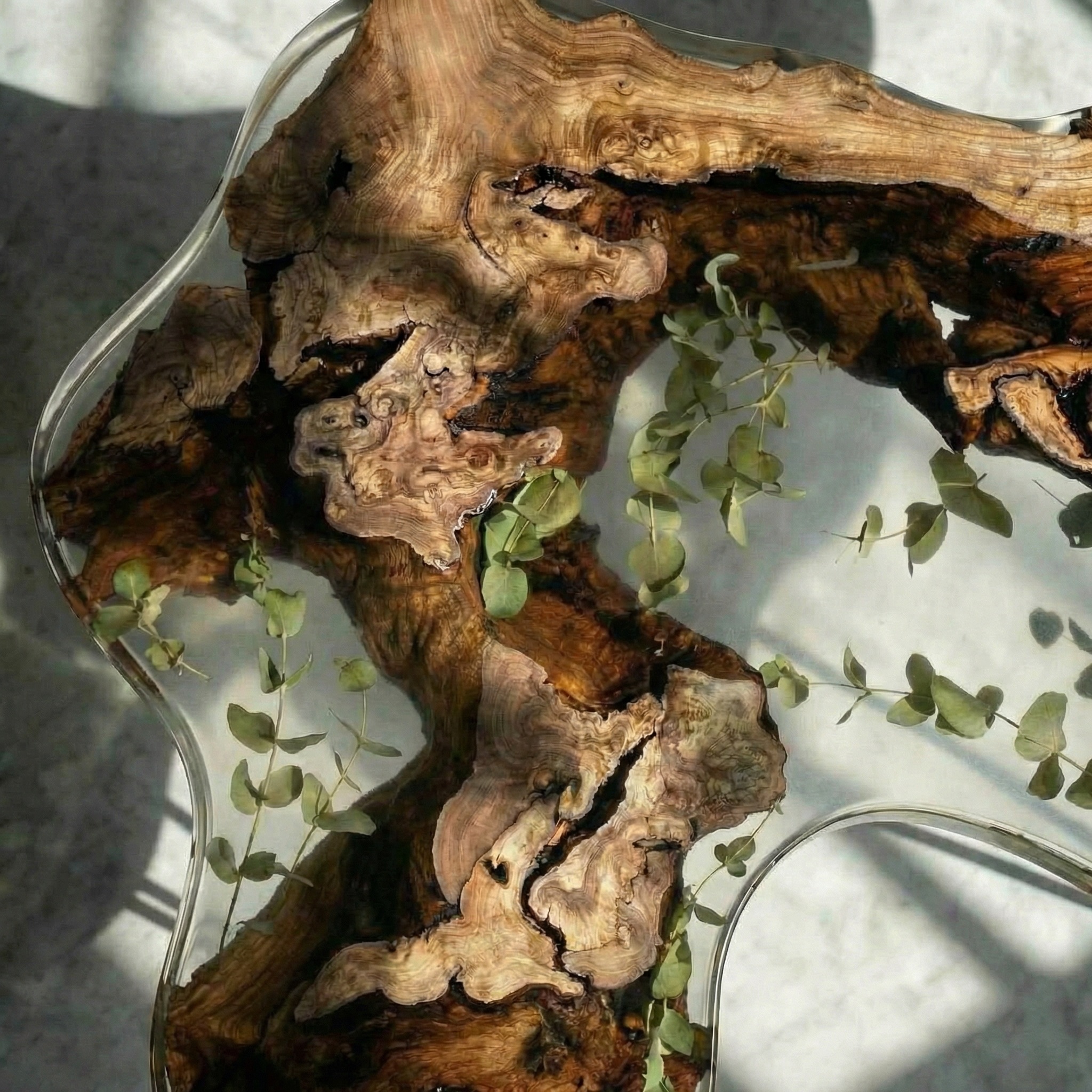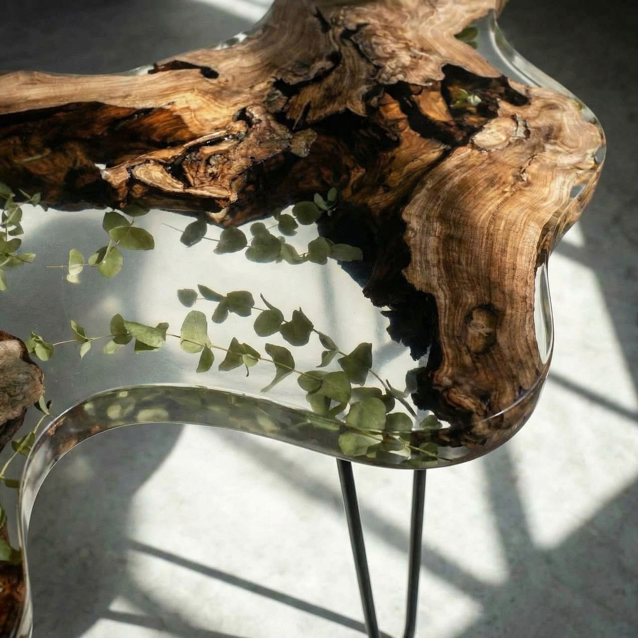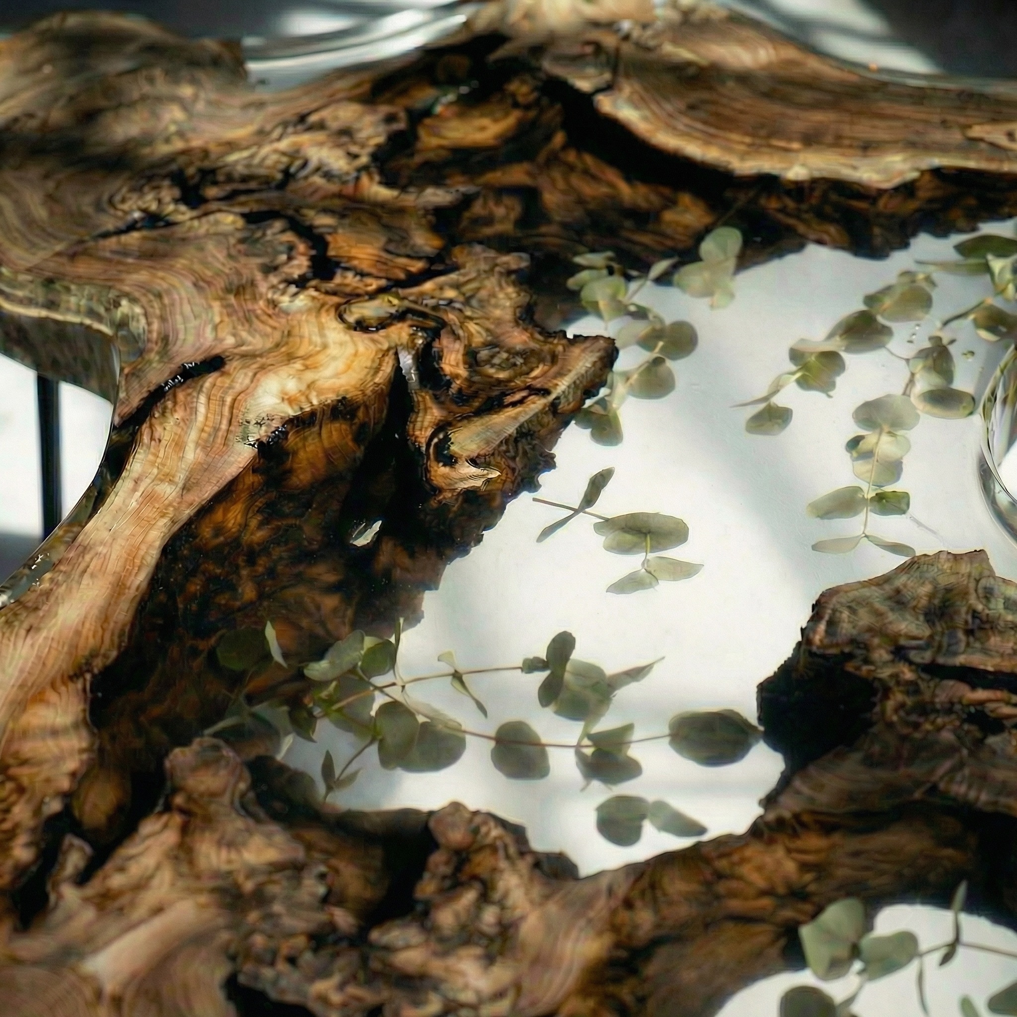 Природа не терпит прямых линий - этот столик создан по её лекалам. Основа - массив горного карагача с дикой, необузданной текстурой, которая переходит в прозрачный слой смолы. Внутри, словно случайно занесённые ветром, застыли тонкие веточки эвкалипта - они зависают в толще материала, создавая эффект гербария, пойманного во времени.
