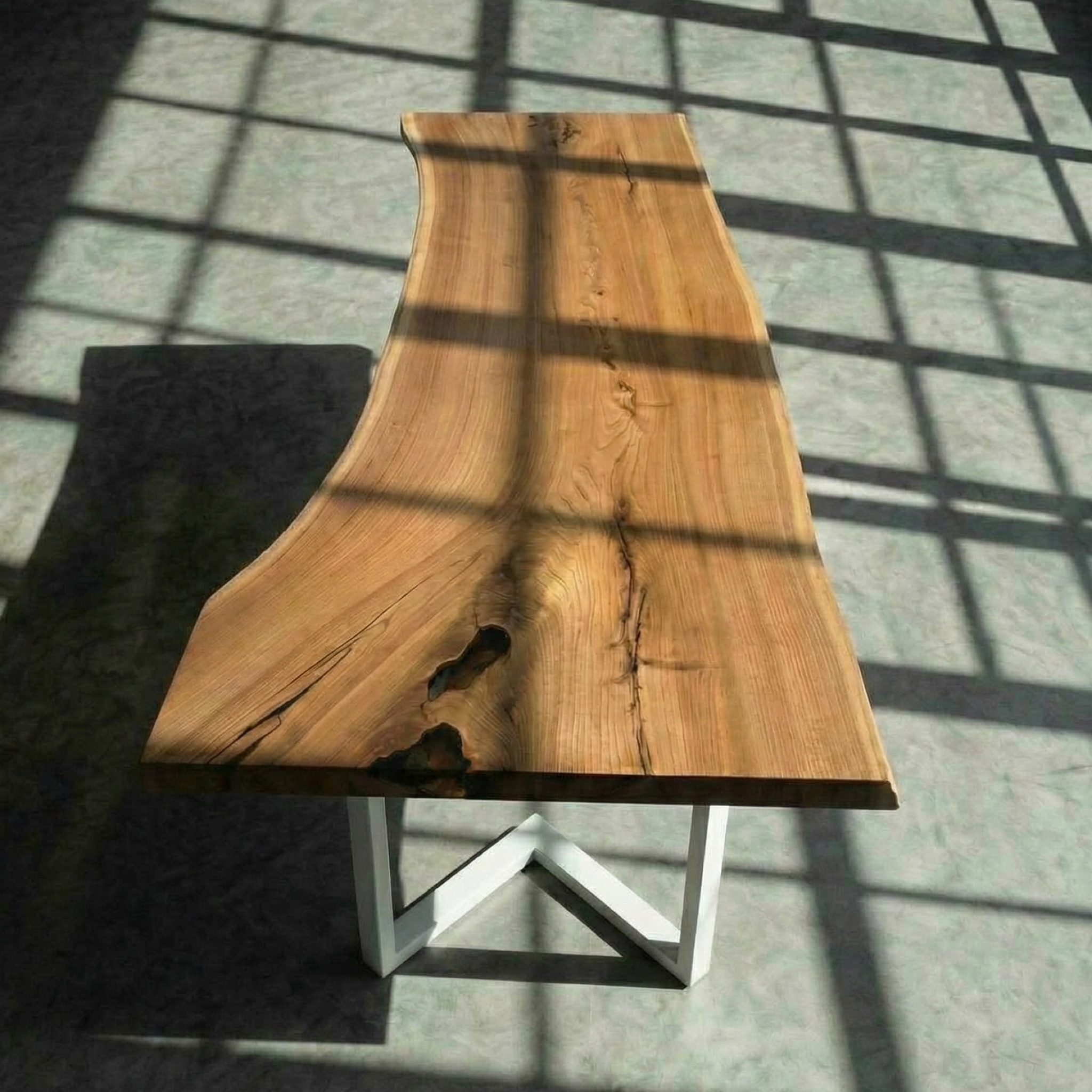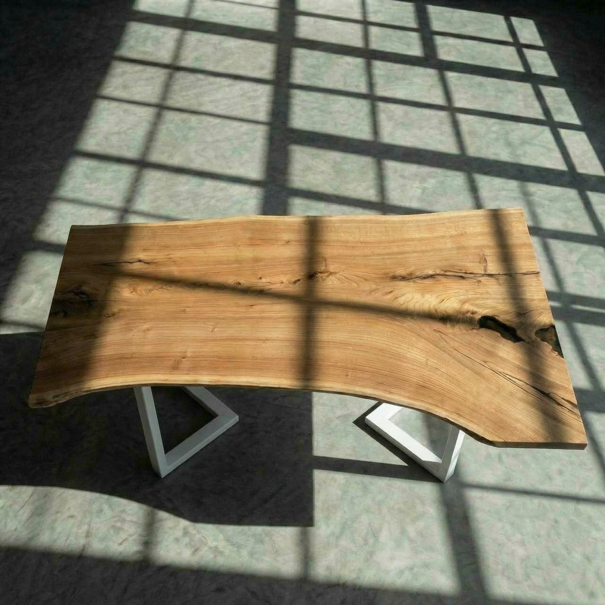 Массив карагача необычной формы - один край вытянутый, плавный, другой расширяется, создавая естественную асимметрию. Живой край бережно очищен от коры, но сохранён в своей природной пластике - с теми изгибами и неровностями, которые делают дерево уникальным.
