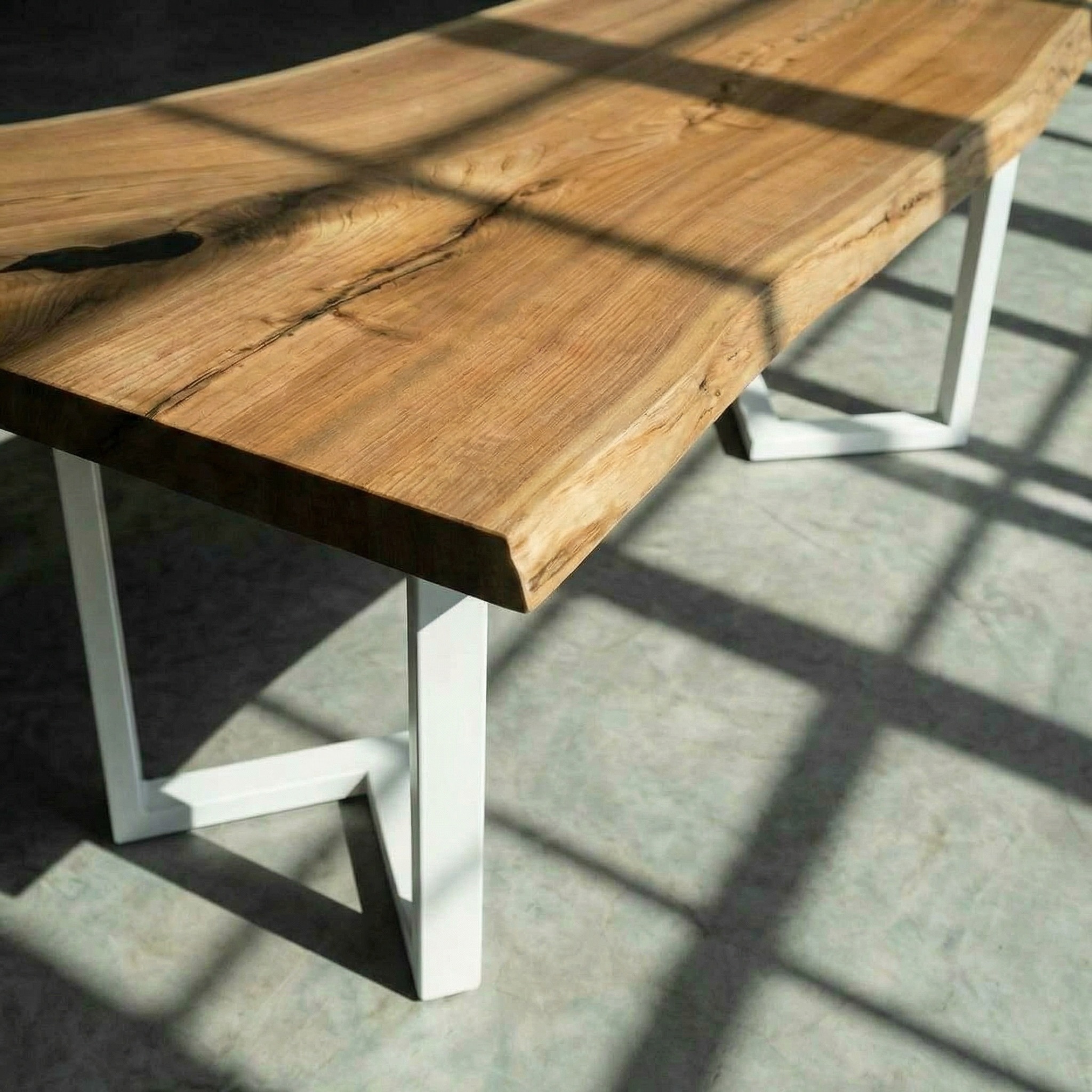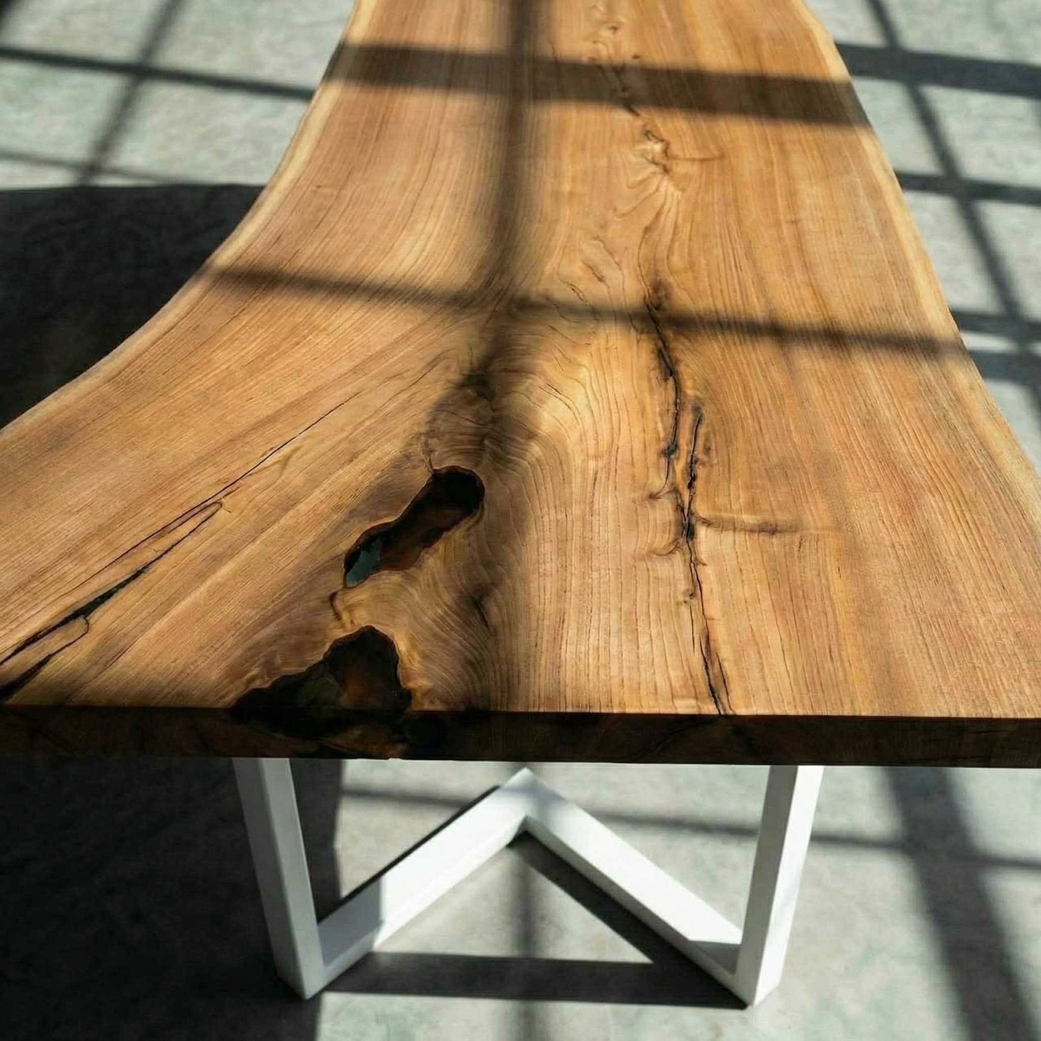 В двух небольших углублениях - заливка эпоксидной смолой. Она не перекрывает плоскость, а лишь акцентирует природные впадины, добавляя лёгкости и света.