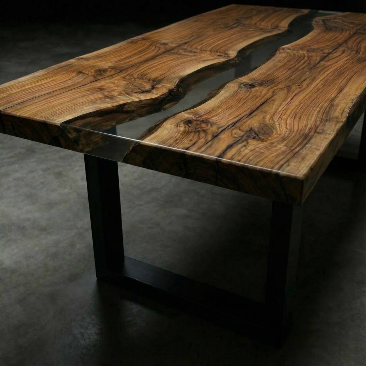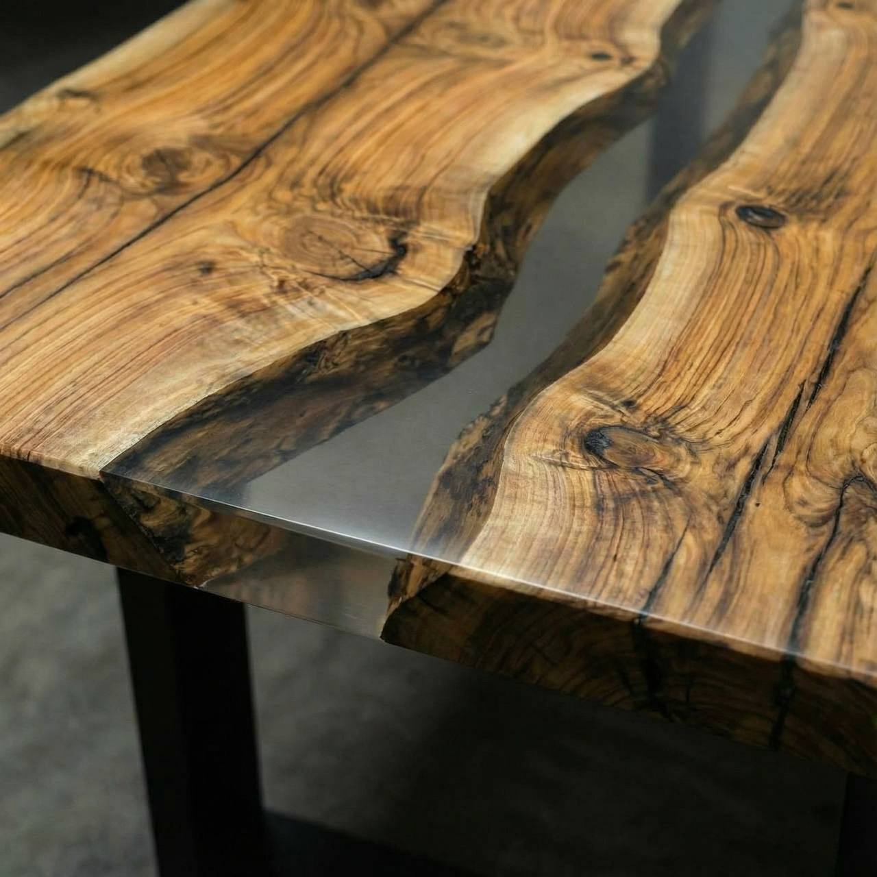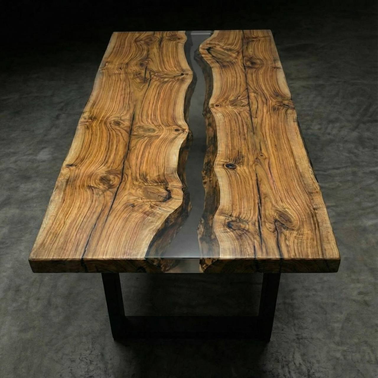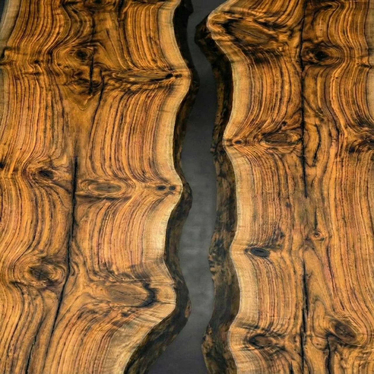 Главная особенность этого стола — контраст фактур. Массив карагача (вяз) славится своей твердостью, благородным оттенком и выразительной структурой древесины. Трещину между двумя половинами массива заполняет прозрачная эпоксидная смола, создавая эффект «застывшей воды». Благодаря прозрачности смолы создается ощущение легкости, а игра света придает изделию объем и глубину.