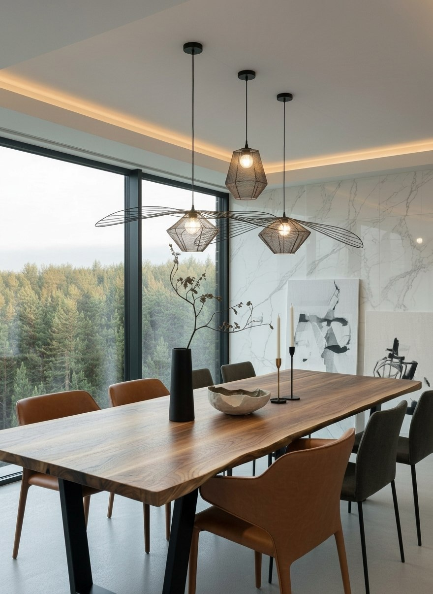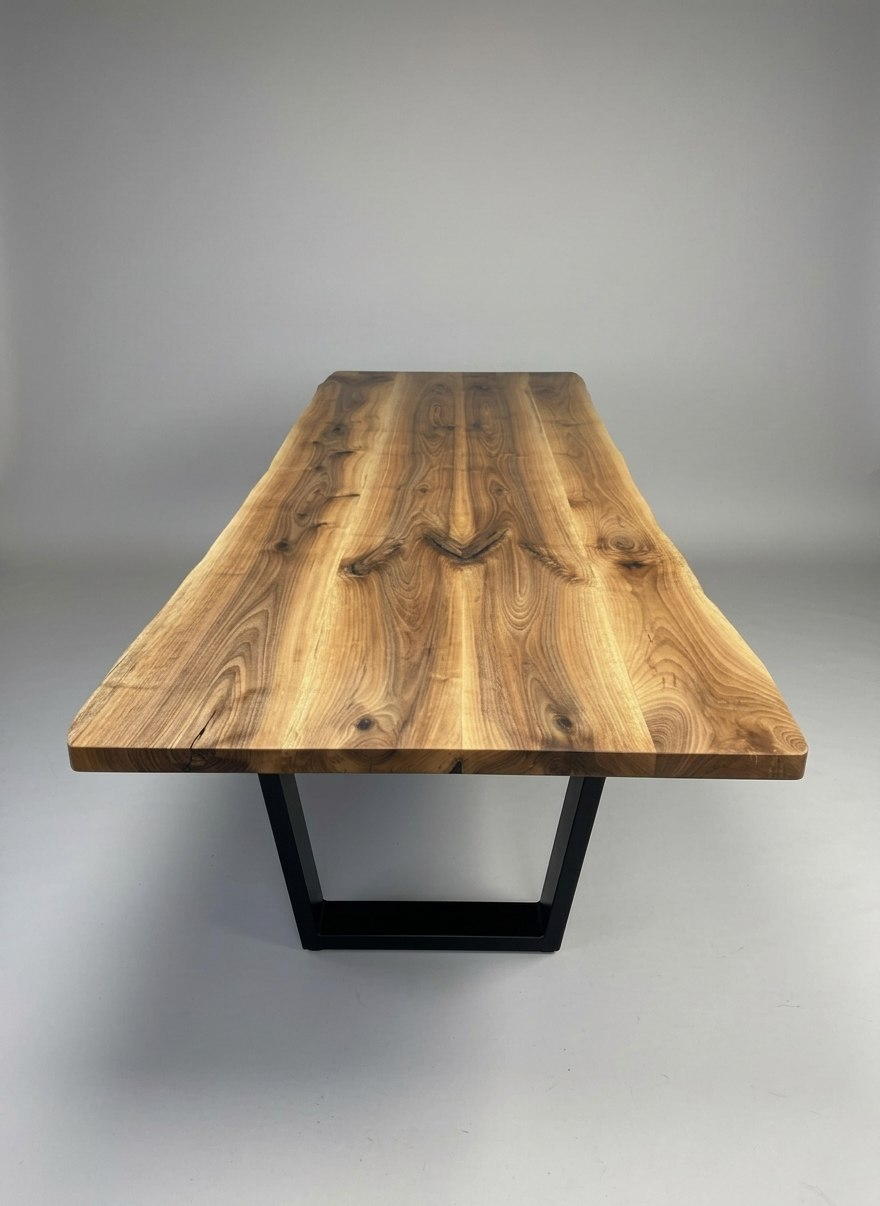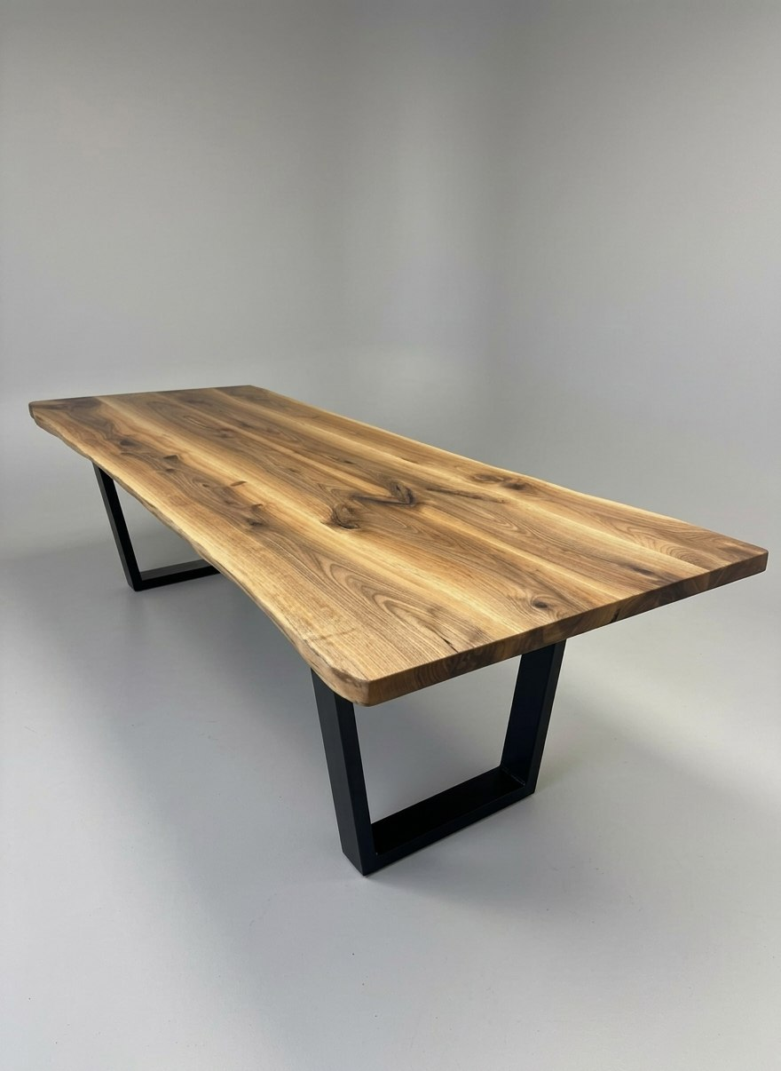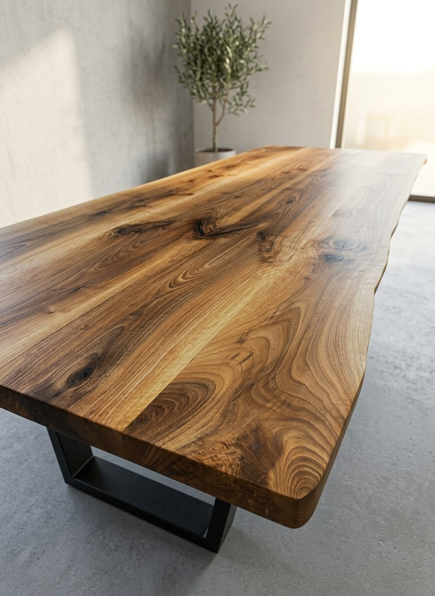 Столешница, изготовленная из тщательно отобранных слебов европейского ореха, подчёркивает естественную текстуру, цвет и плавные изгибы кромок, которые делают орех таким востребованным материалом в элитной столярной обработке. Для отделки мы используем растительное масло — долговечный, водостойкий и экологичный материал, который пользуется популярностью у производителей элитных обеденных столов и современной деревянной мебели.