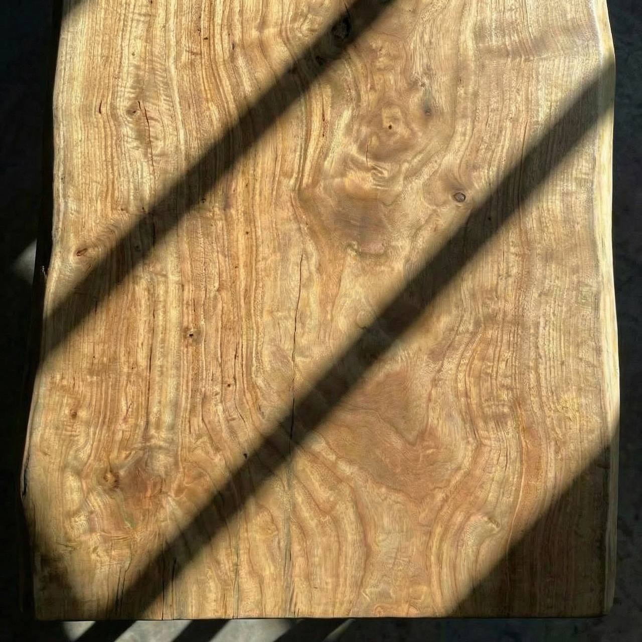 Цельный массивный слэб горного тополя с уникальным рисунком свилеватой структуры: волокна переплетаются в причудливый узор, переливаясь на свету всеми оттенками мёда и золота.