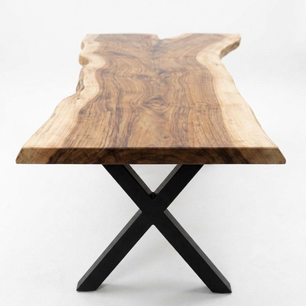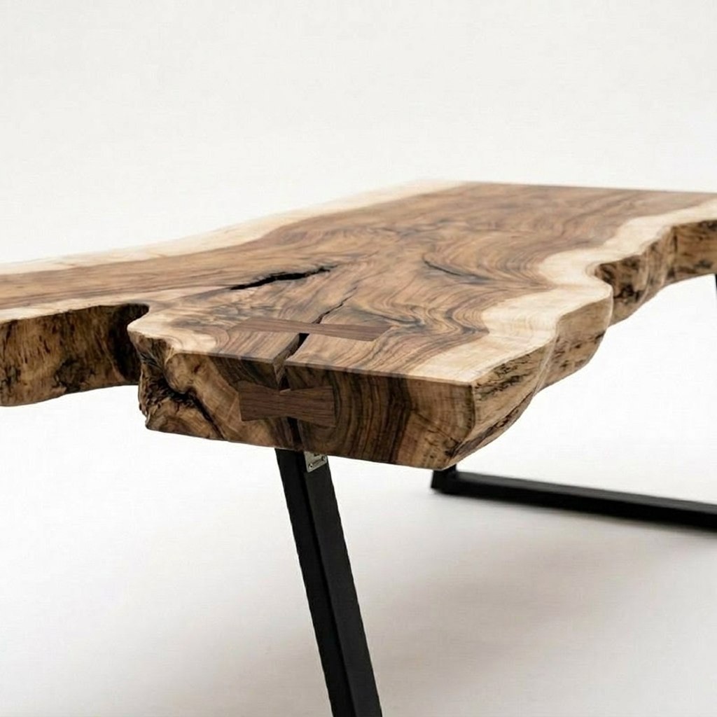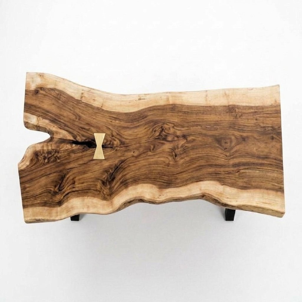 стол ROW 400 — это слэб с характером, который не усмиряли. Его дикая, свободная форма продиктована самим слэбом ясеня: массив изгибается, дышит и живёт собственной пластикой, не подчинённой строгой геометрии. По телу древесины проходит красивая трещина — не дефект, а честный автограф времени, который мы не стали скрывать. Никакой эпоксидной смолы: трещины филигранно стянуты столярными бабочками, и эти аккуратные вставки добавляют ещё один слой фактурности в общую графику. Завершает образ выразительный контрастный обзол: светлая заболонь драматично встречается с тёмным ядром, создавая ту самую игру тонов, ради которой и выбирают ясень.