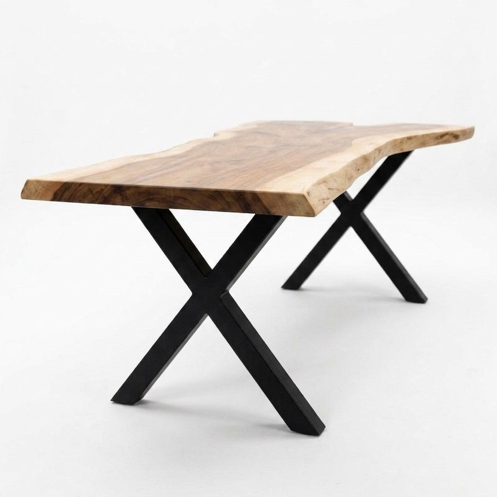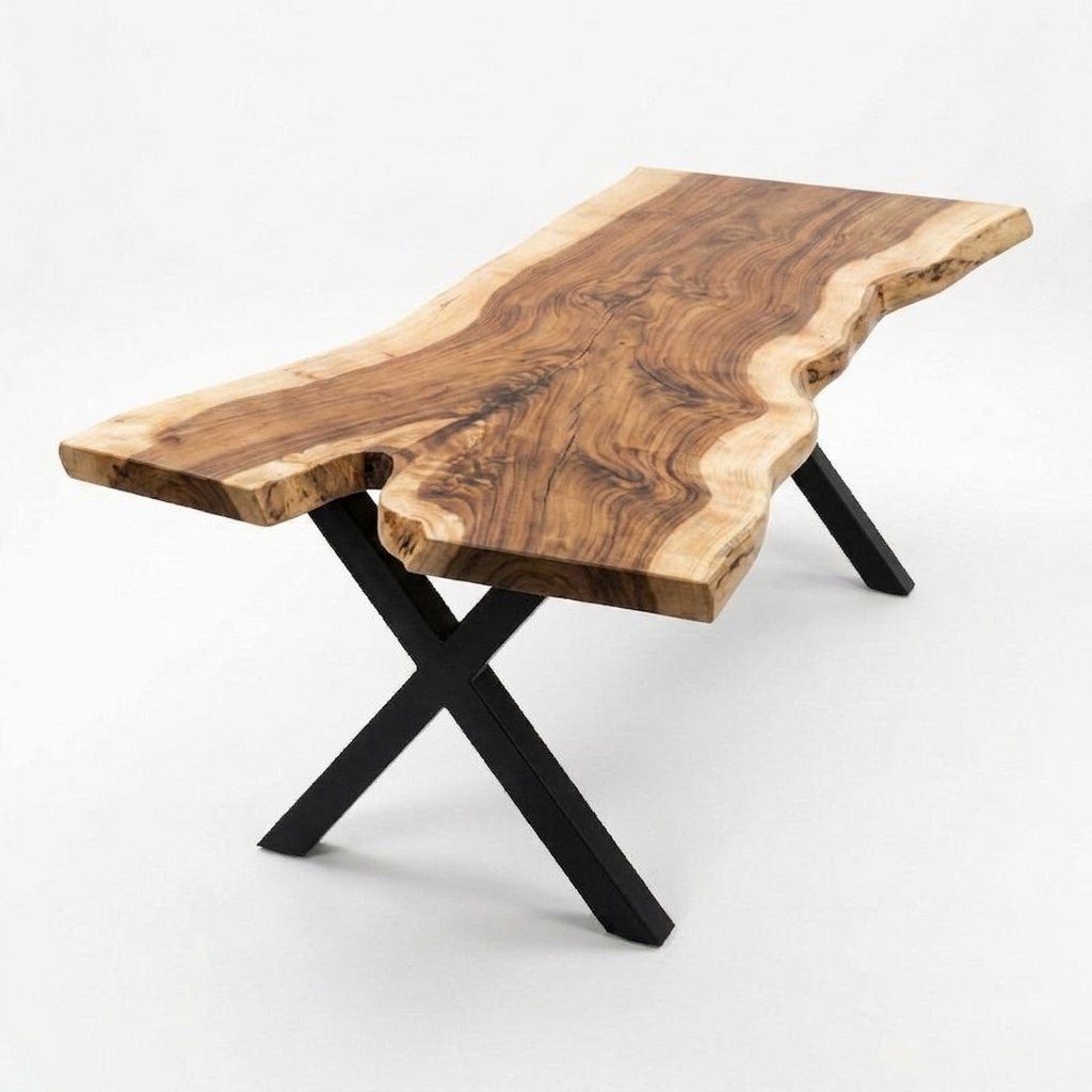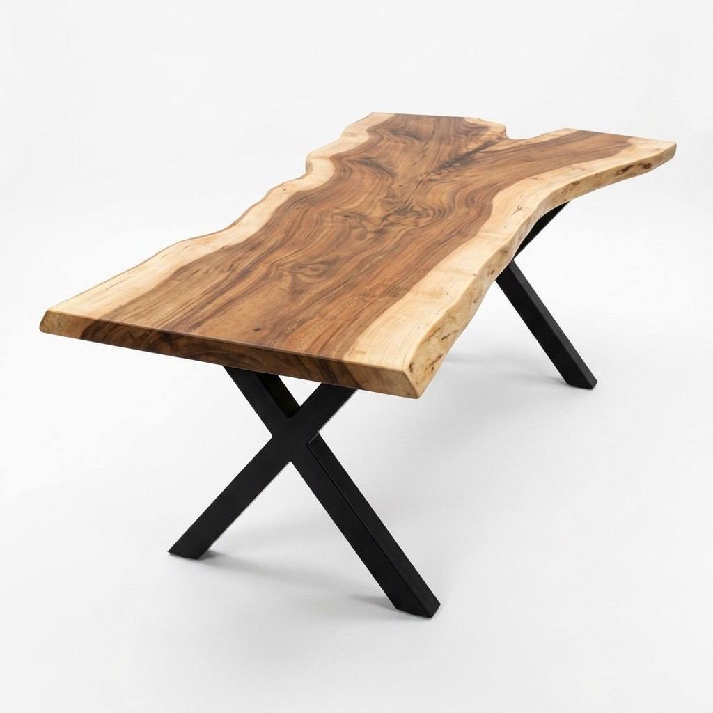 стол ROW 400 — это слэб с характером, который не усмиряли. Его дикая, свободная форма продиктована самим слэбом ясеня: массив изгибается, дышит и живёт собственной пластикой, не подчинённой строгой геометрии. По телу древесины проходит красивая трещина — не дефект, а честный автограф времени, который мы не стали скрывать. Никакой эпоксидной смолы: трещины филигранно стянуты столярными бабочками, и эти аккуратные вставки добавляют ещё один слой фактурности в общую графику. Завершает образ выразительный контрастный обзол: светлая заболонь драматично встречается с тёмным ядром, создавая ту самую игру тонов, ради которой и выбирают ясень.