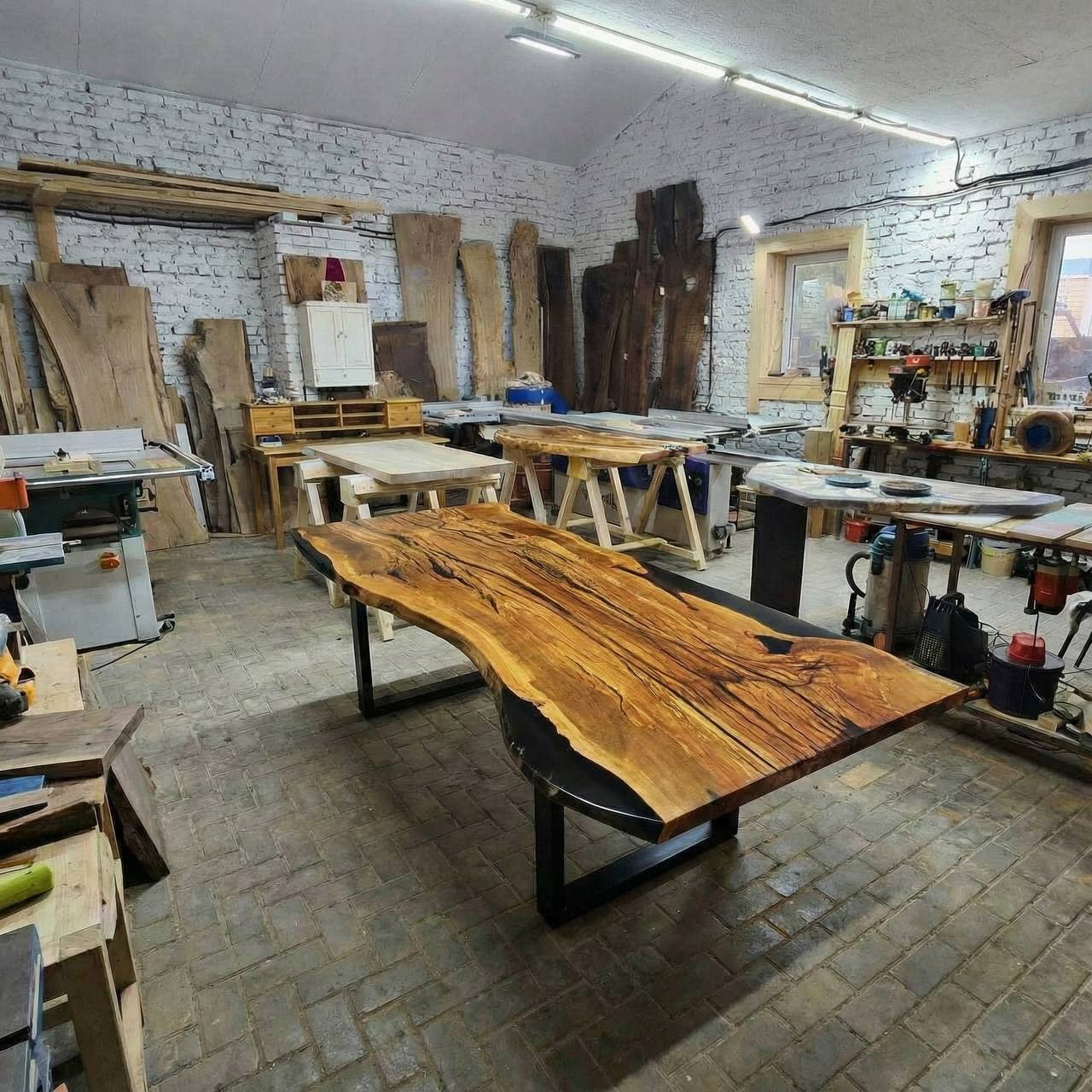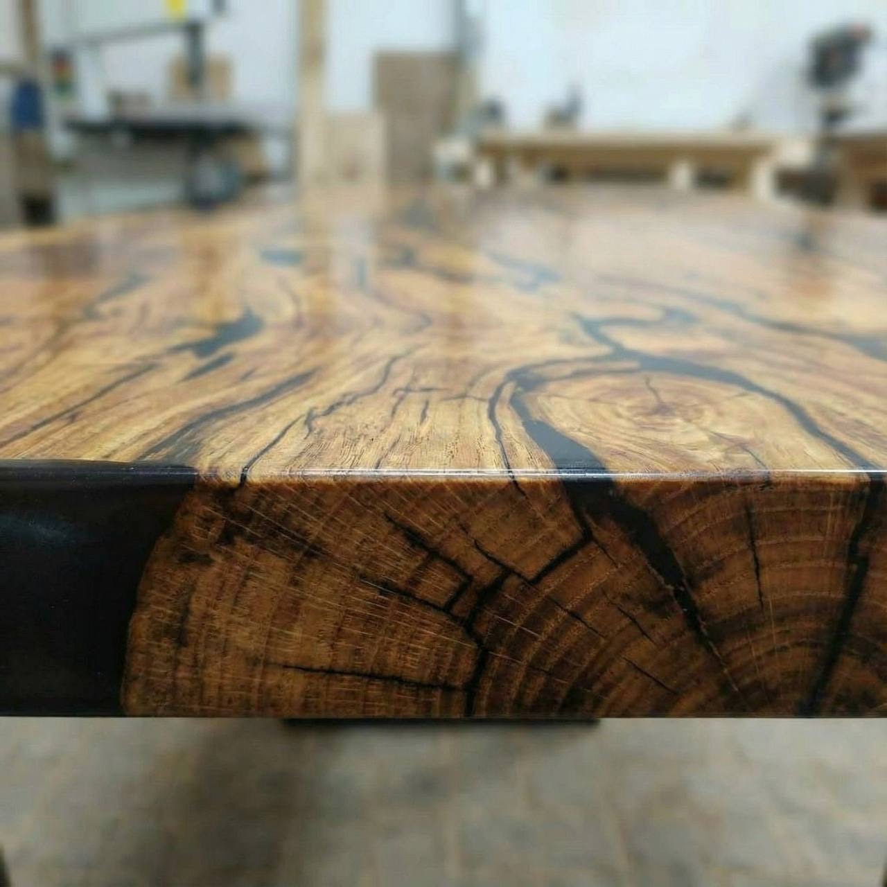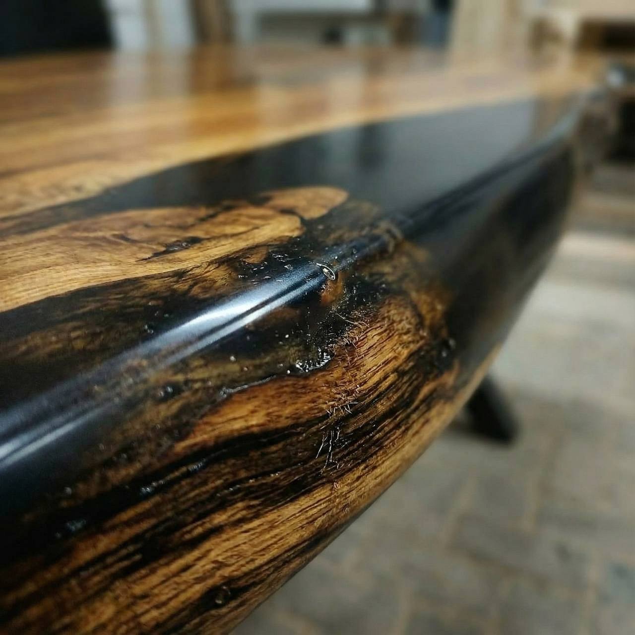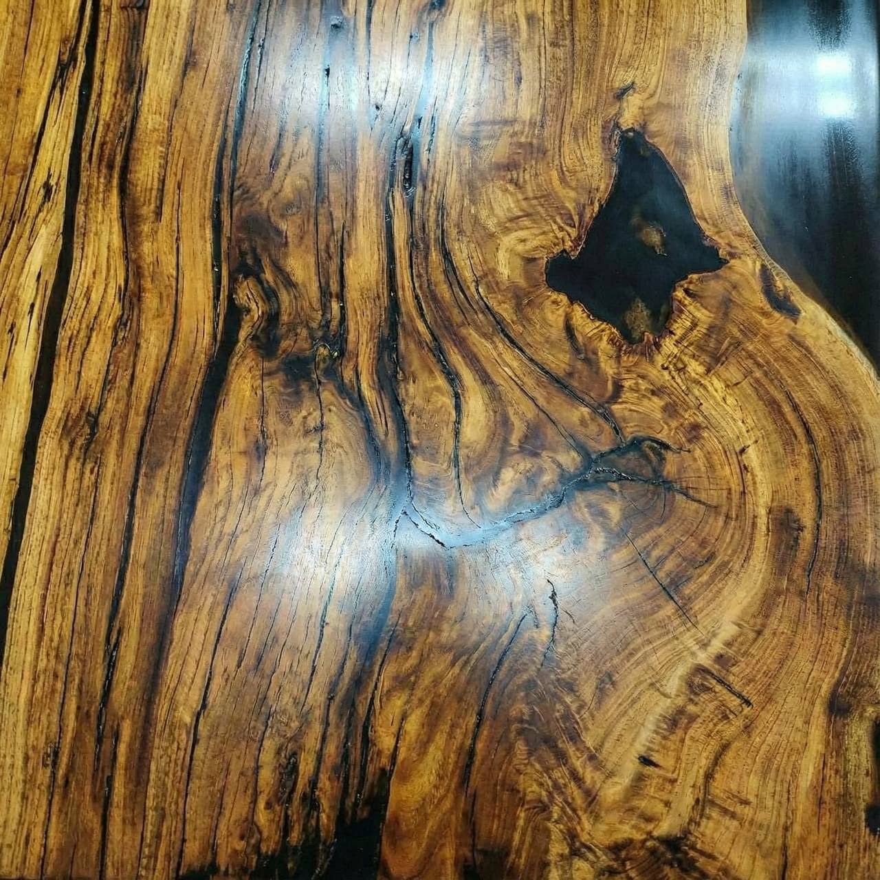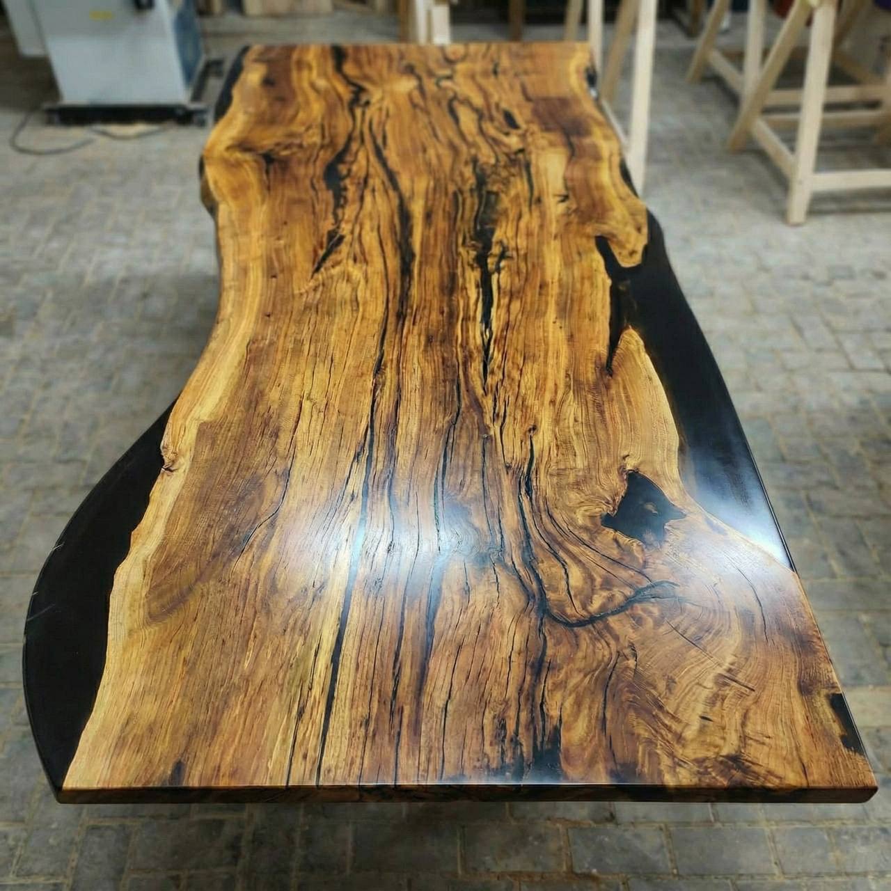 Эпоксидная смола использована по-минимуму, лишь там, где того потребовала природная текстура дерева. Она не перетягивает внимание, а деликатно заполняет естественные нюансы древесины, сохраняя абсолютное первенство натурального материала.