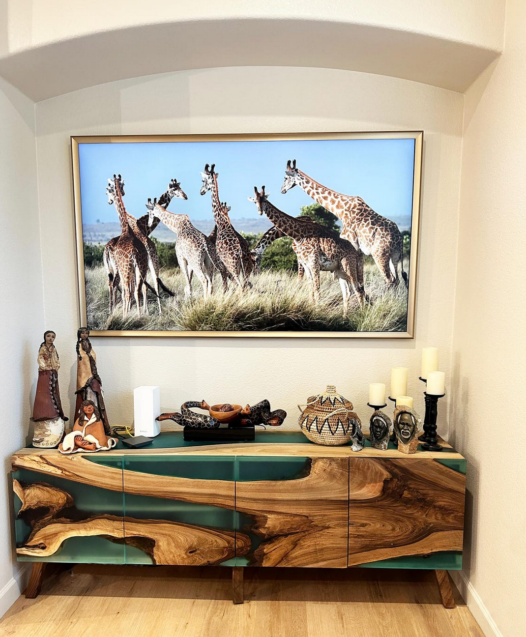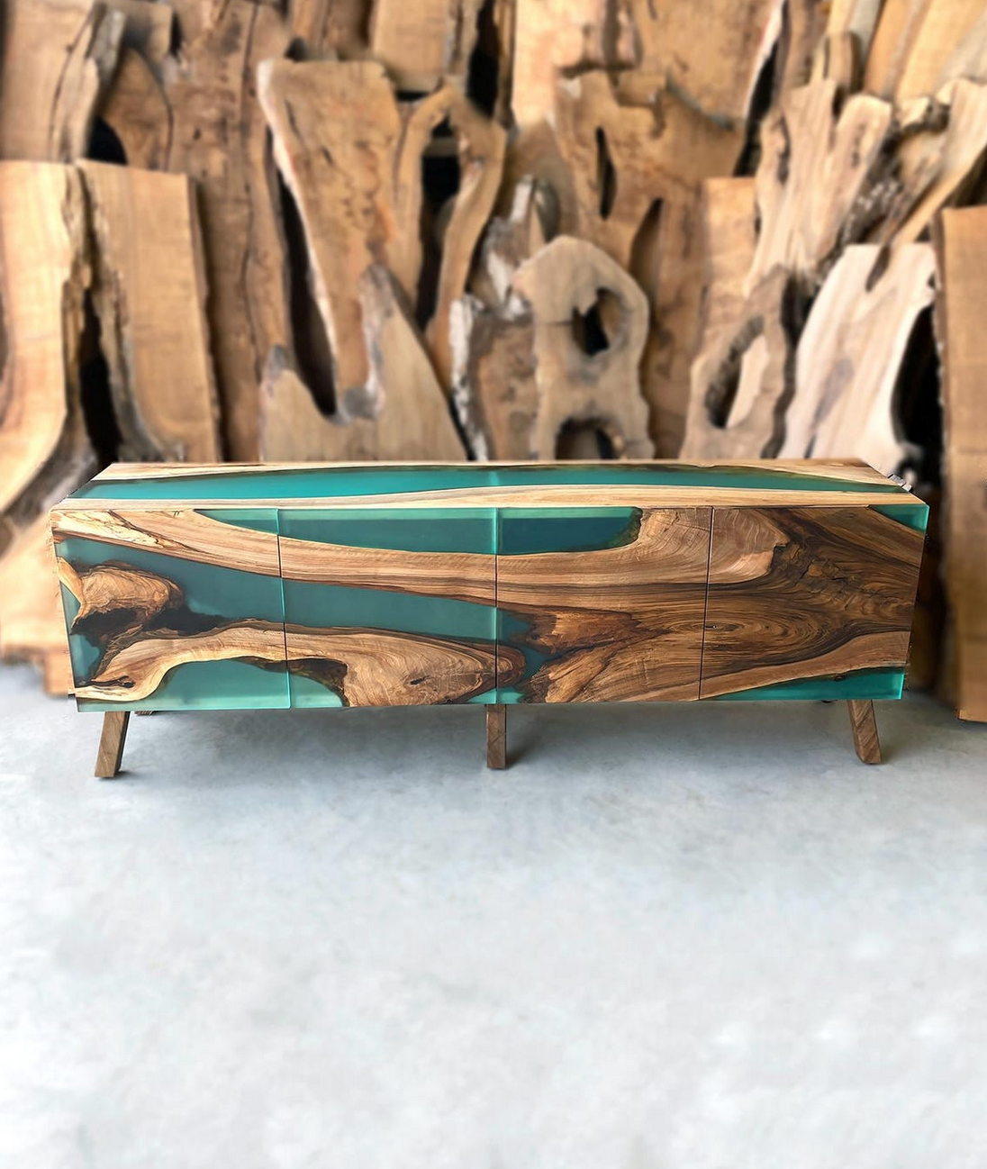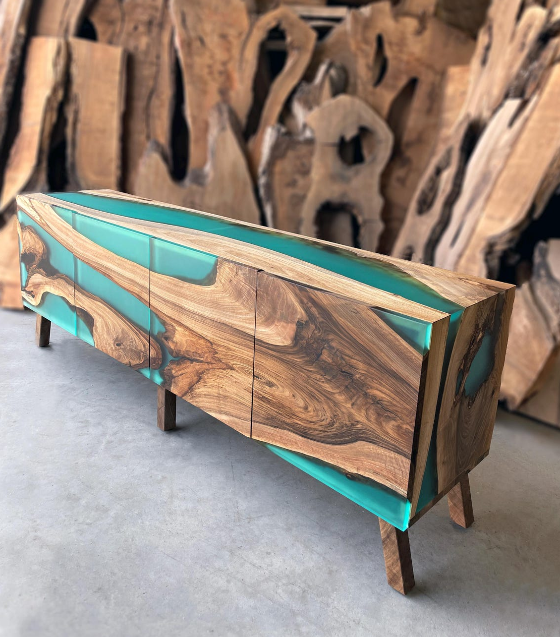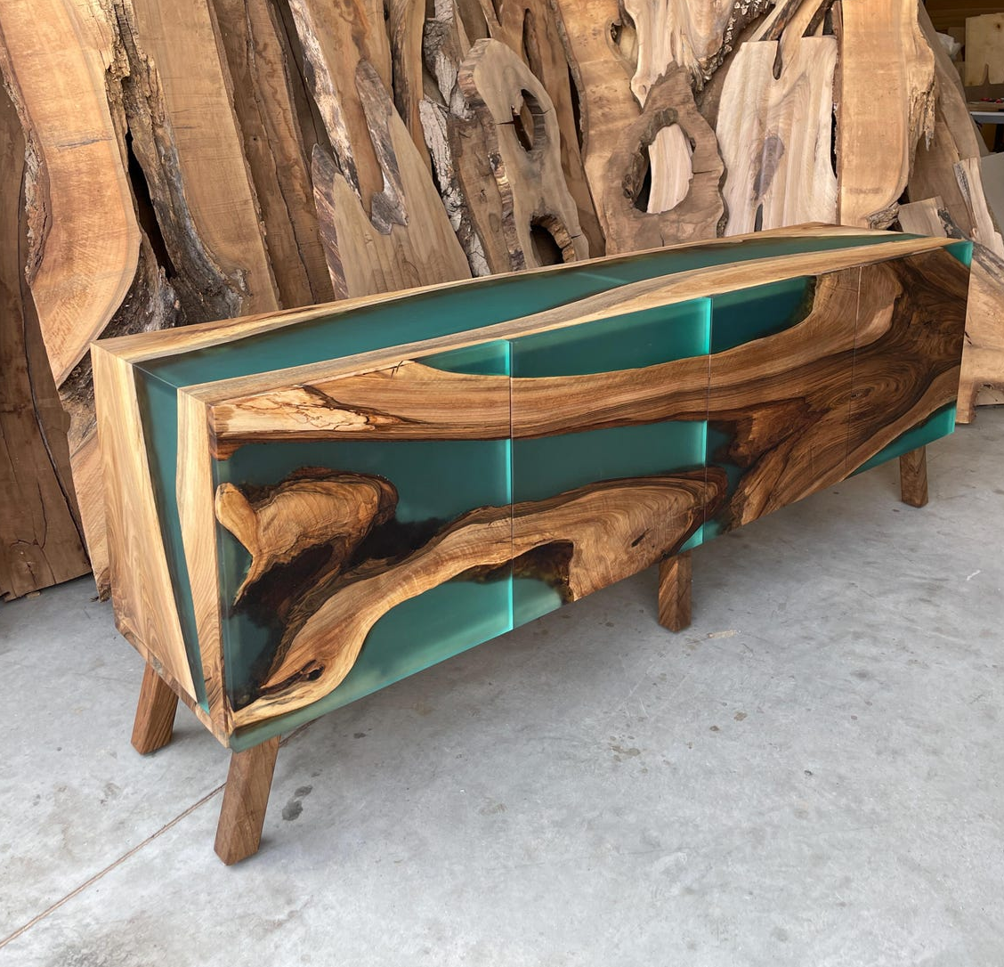 Полный массив: И корпус, и фасады изготовлены из благородного ореха, соединенного матовой бирюзовой смолой, что обеспечивает целостность дизайна и премиальный статус мебели.