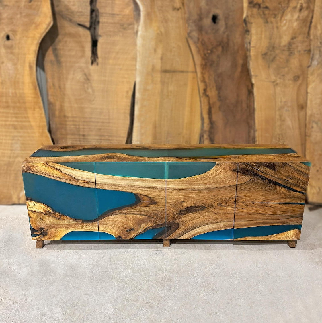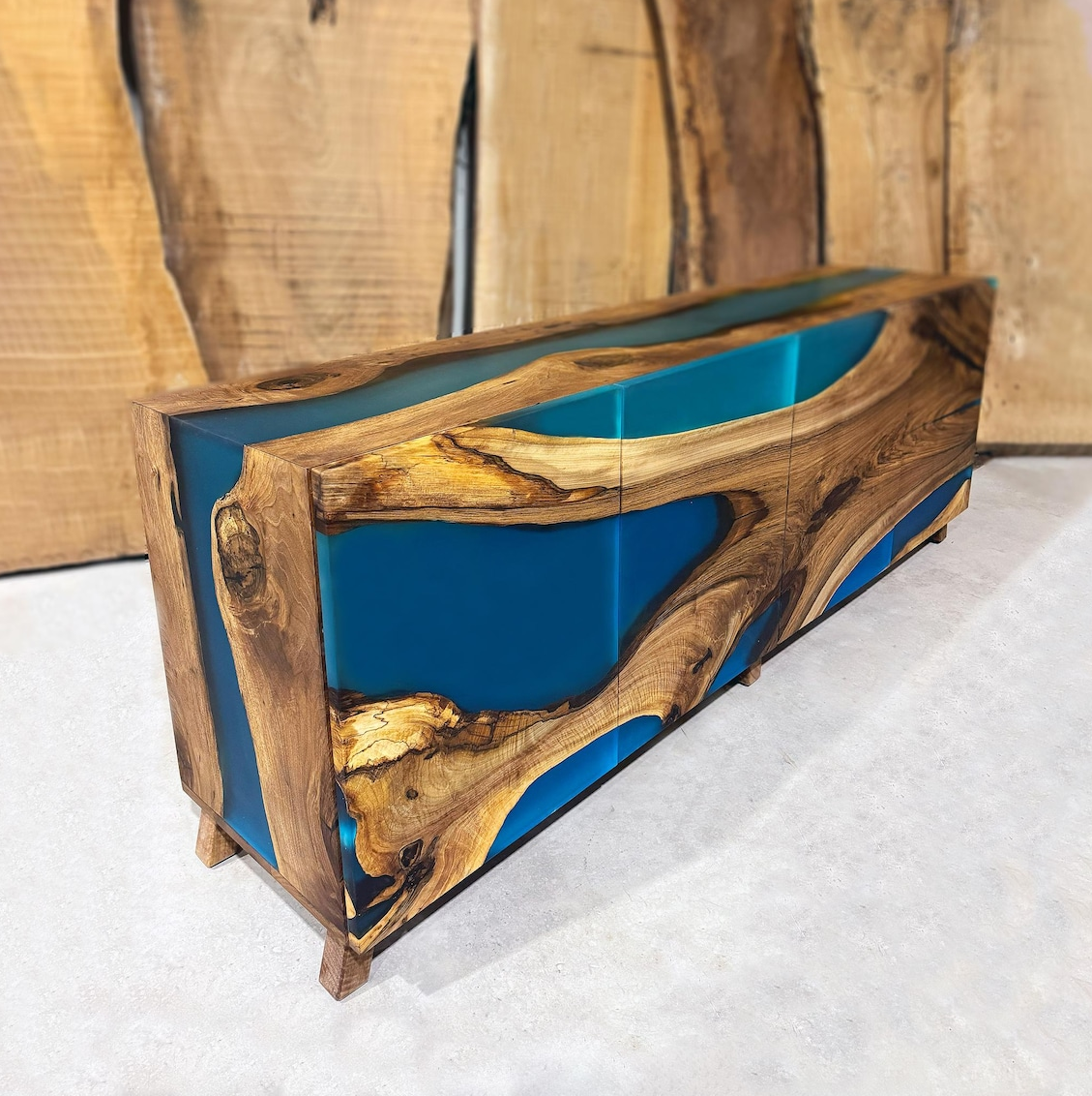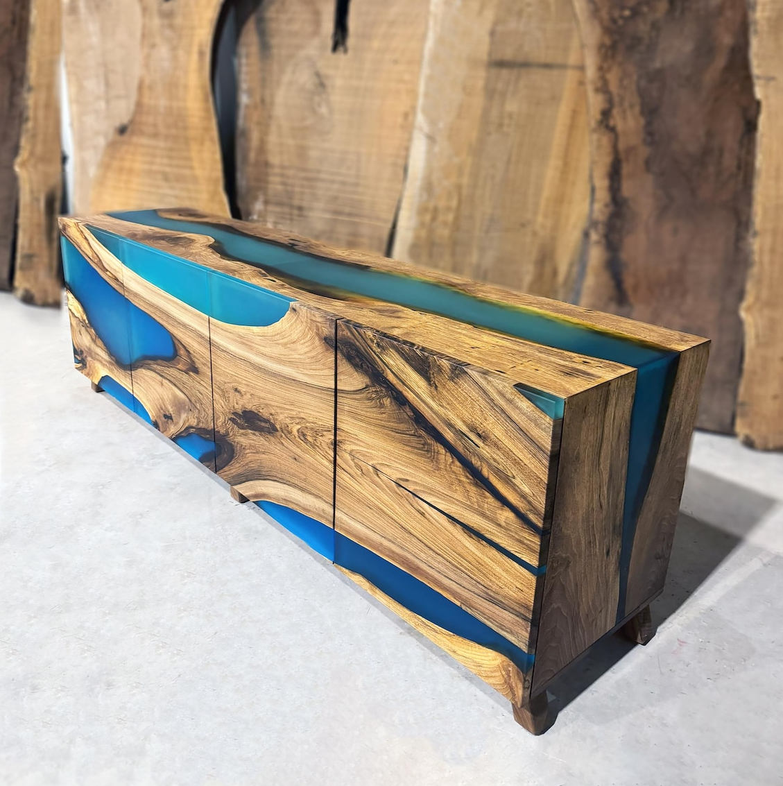 Эффект водопада: Рисунок дерева и смолы плавно перетекает со столешницы на боковины, создавая бесшовный, монолитный образ.