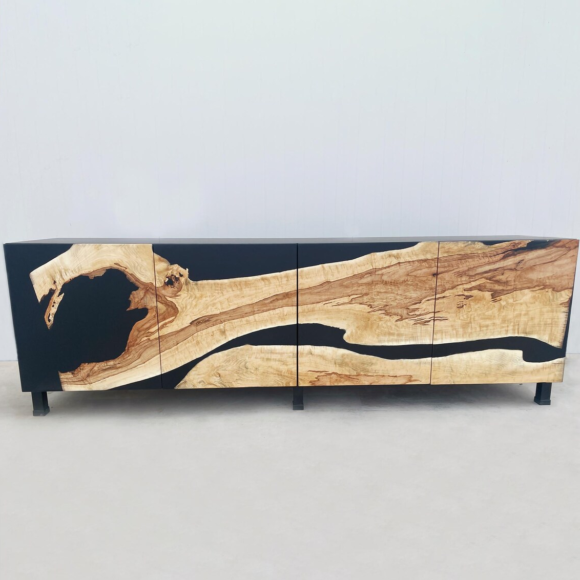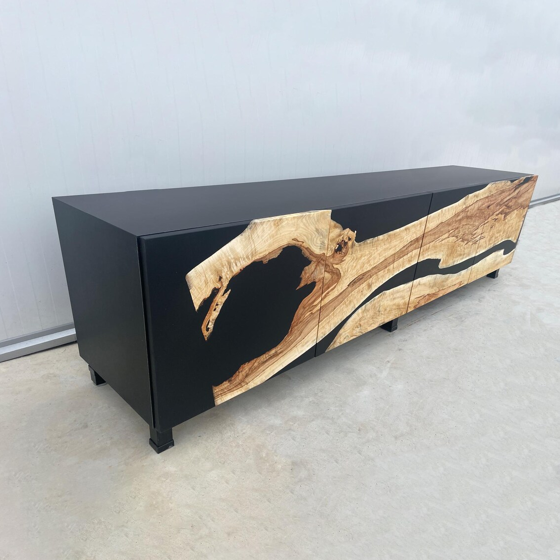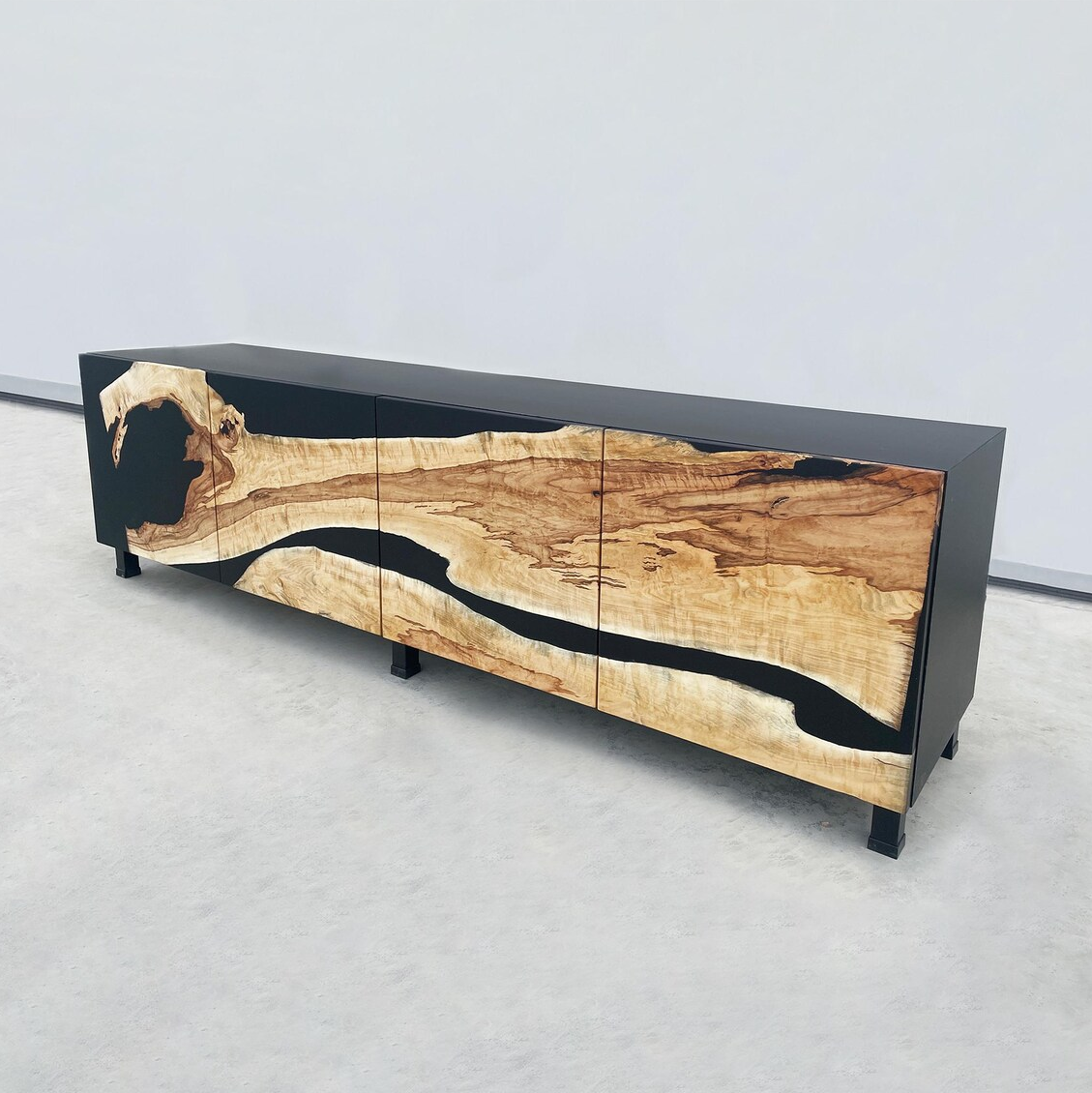 Дизайн и надежность: Черная смола эффектно подчеркивает сучки и трещины дерева, одновременно стабилизируя массив и гарантируя прочность на десятилетия.