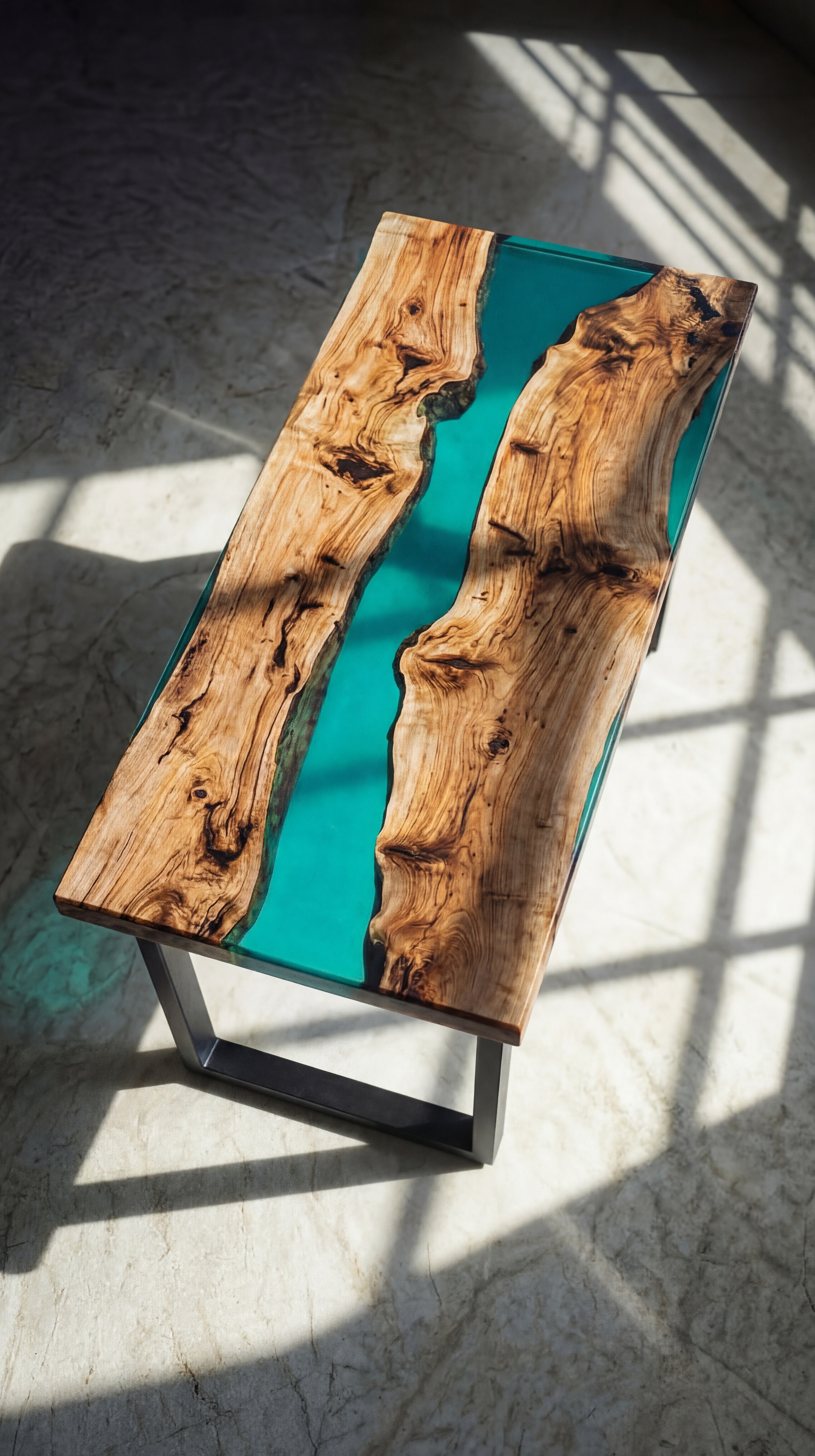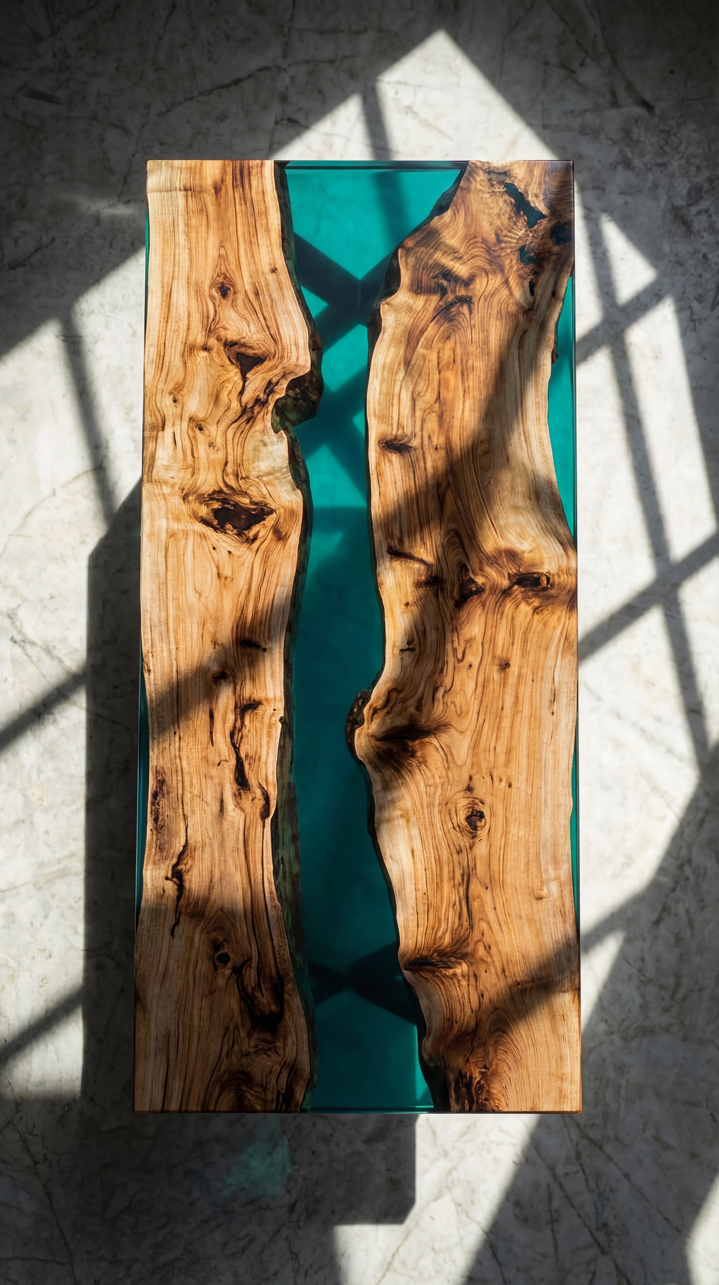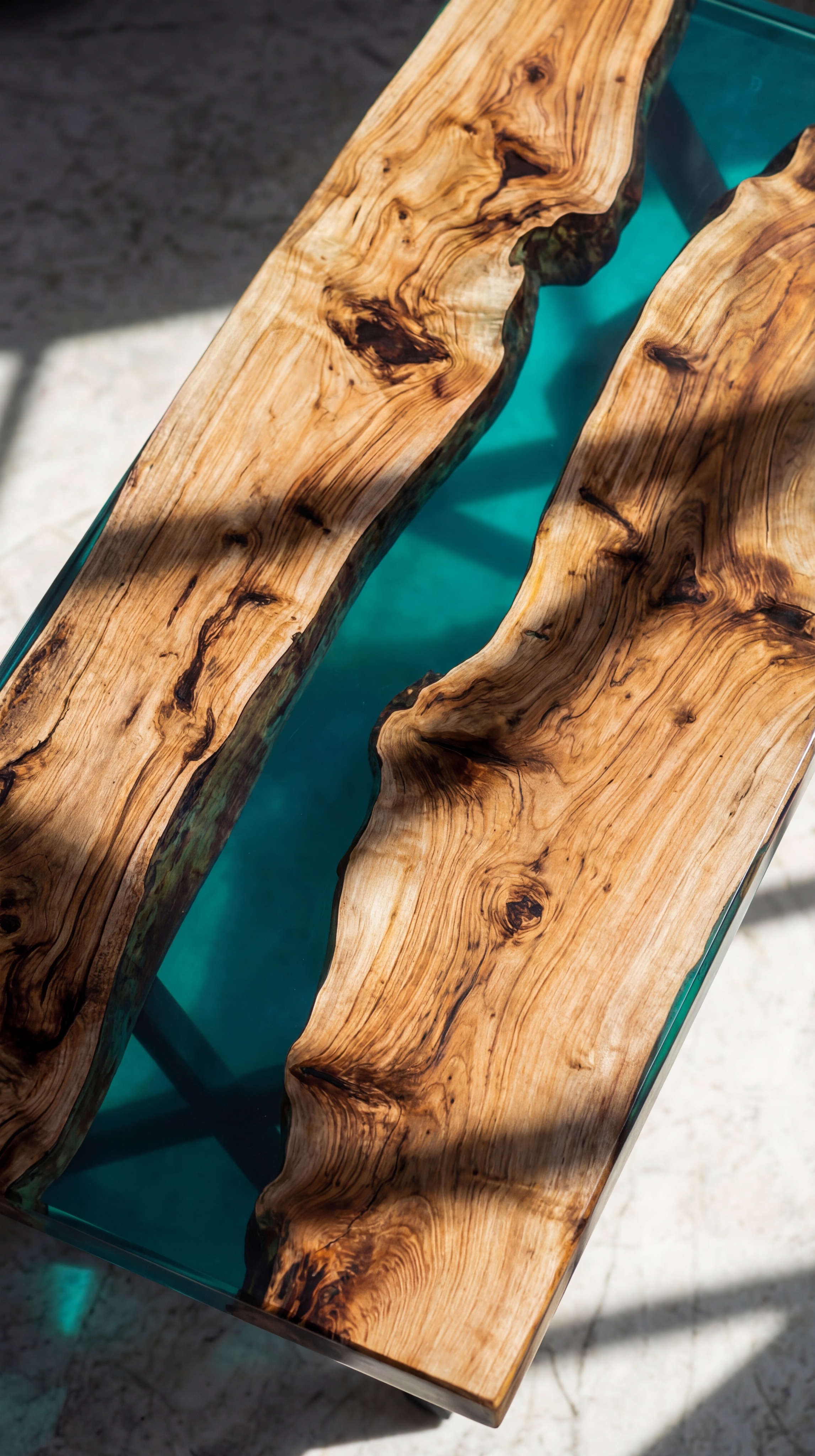 Два слэба карагача с насыщенной, живой текстурой - природные завитки, тёмные глубины, медовые прожилки. Между ними - река из полупрозрачной бирюзовой смолы. Мягкая, светящаяся, она работает акцентом, не перебивая дерево, а добавляя ему свежести и глубины.