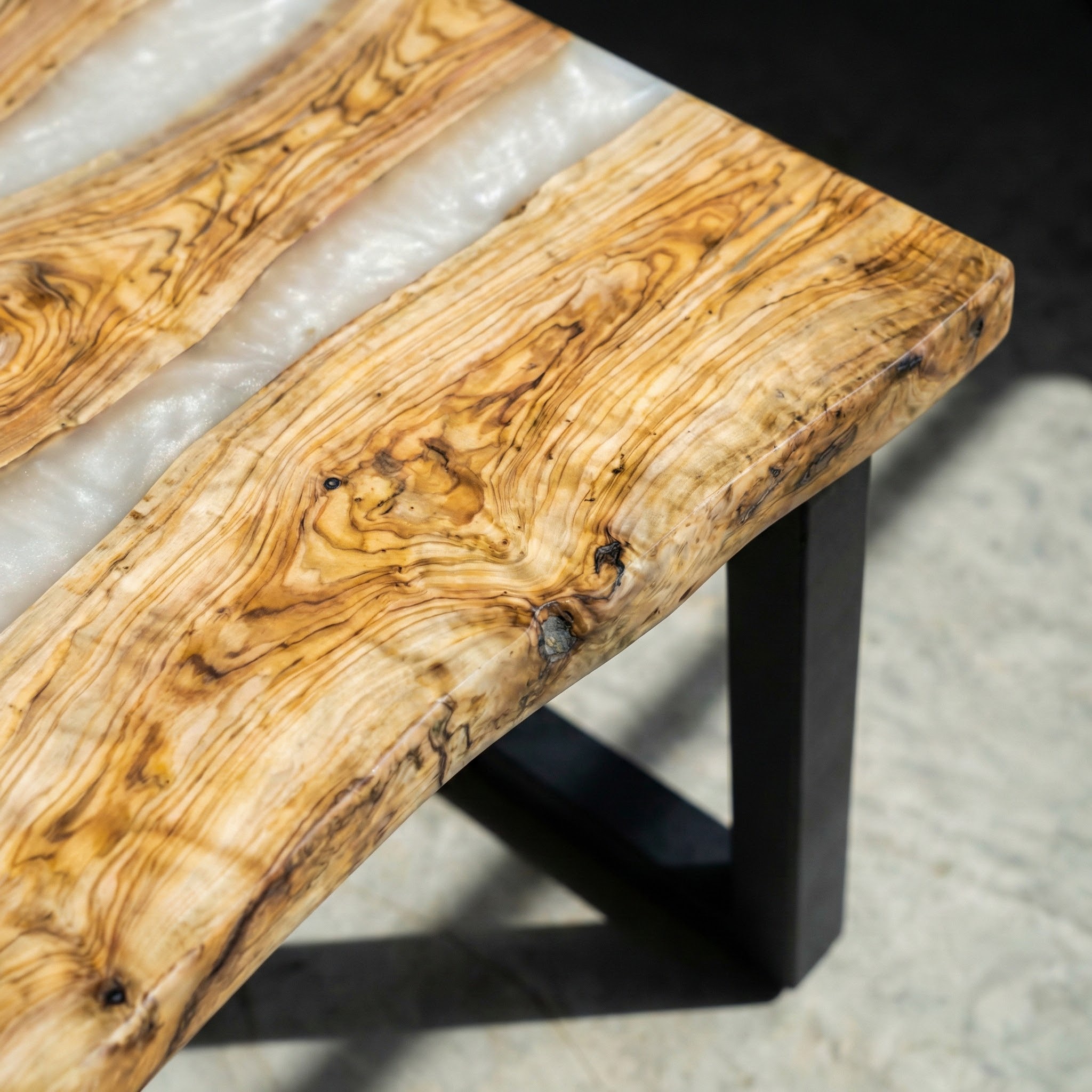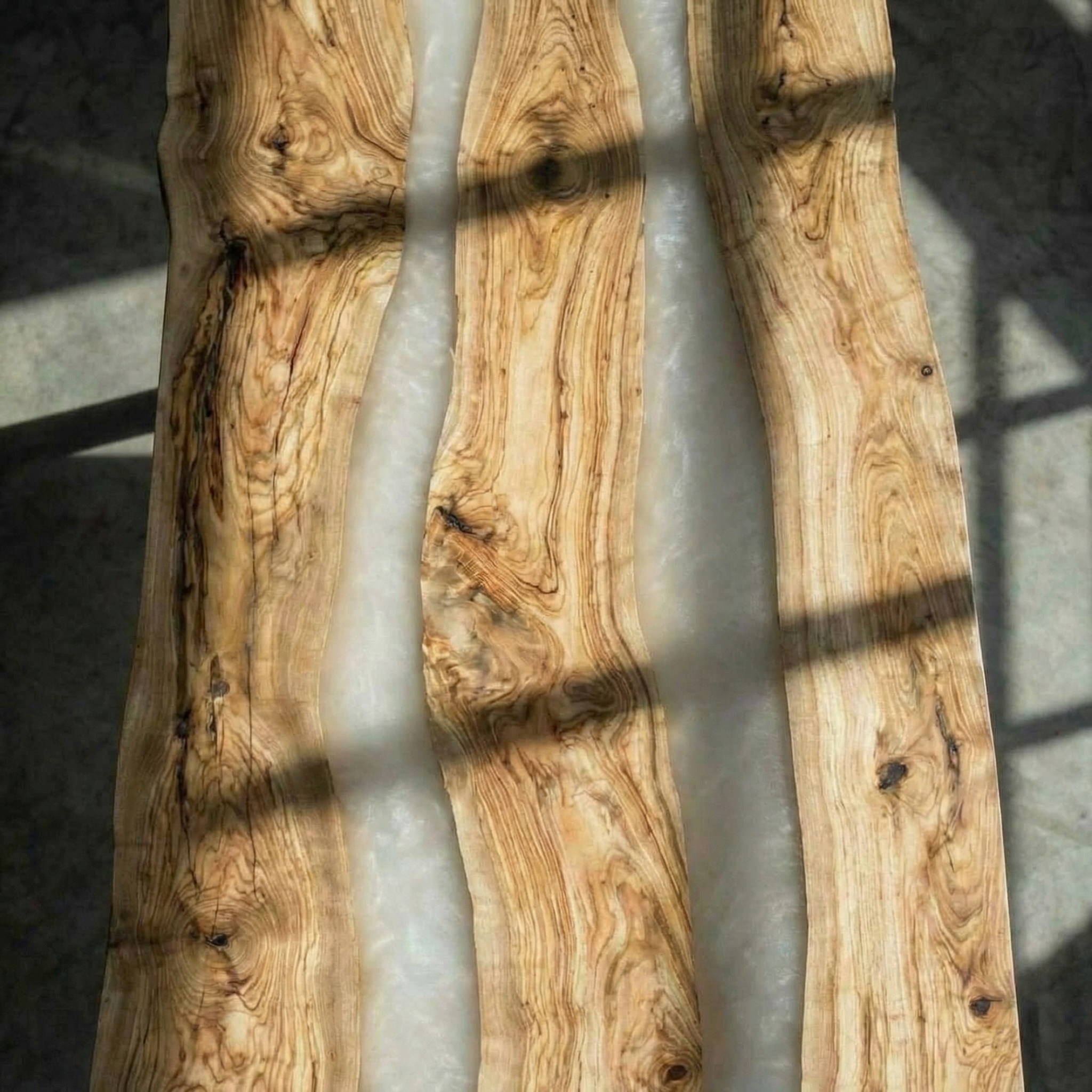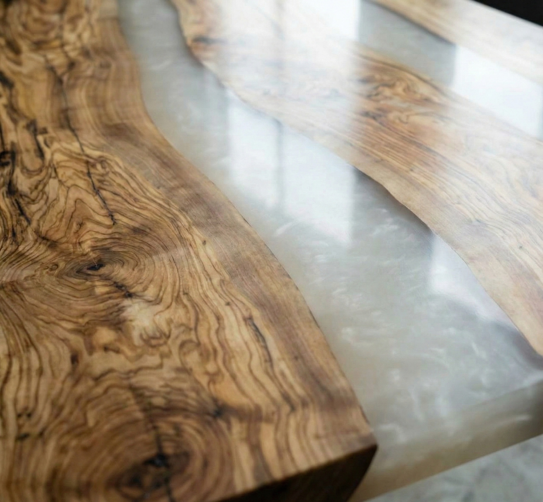 Между слэбами - две реки из перламутровой молочной смолы. Она мягко светится, переливается на свету, оставаясь нежной, без резкого блеска. Молочная основа с перламутровым отливом соединяет деревянные фрагменты, создавая воздушные, струящиеся прослойки.
