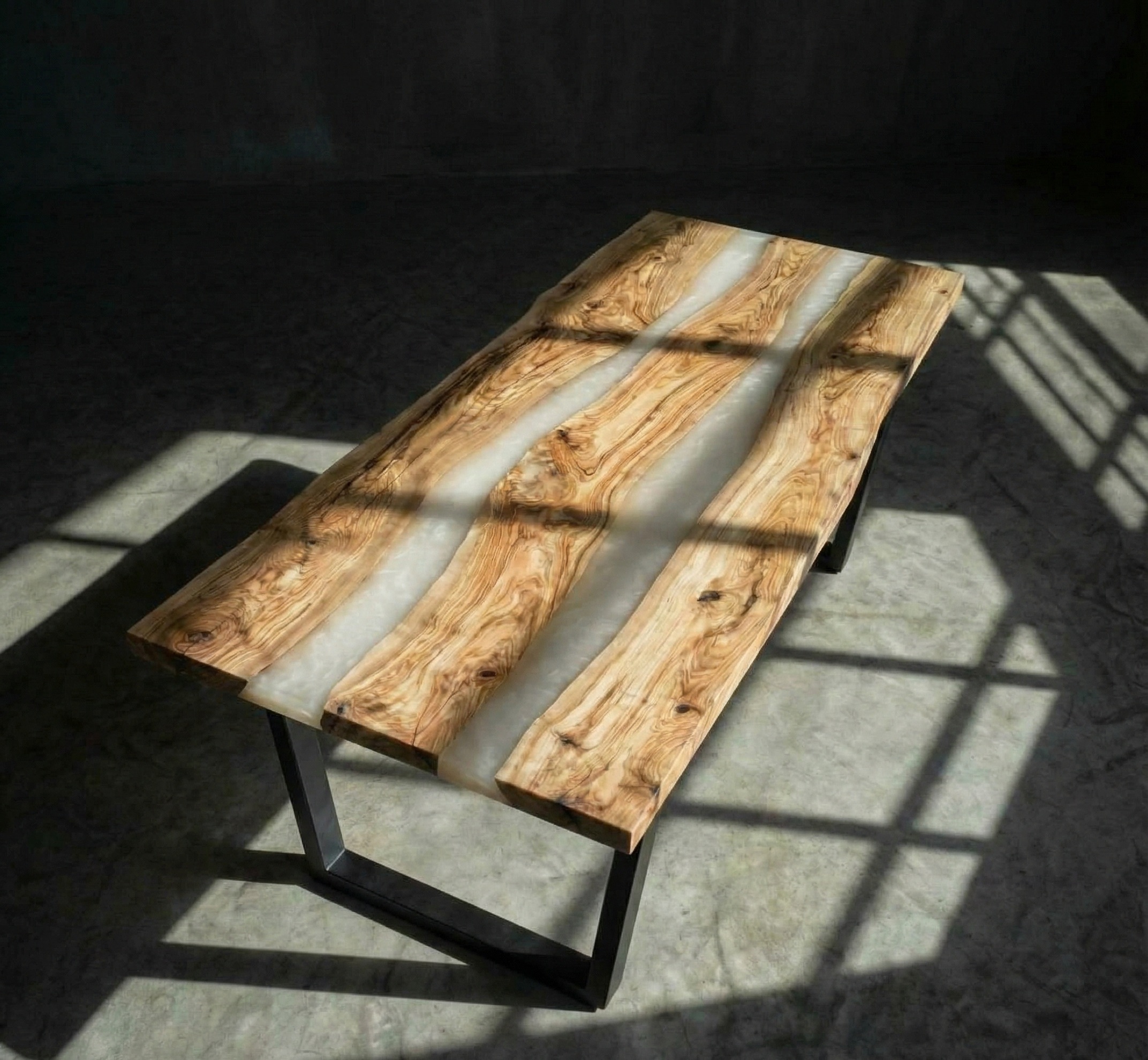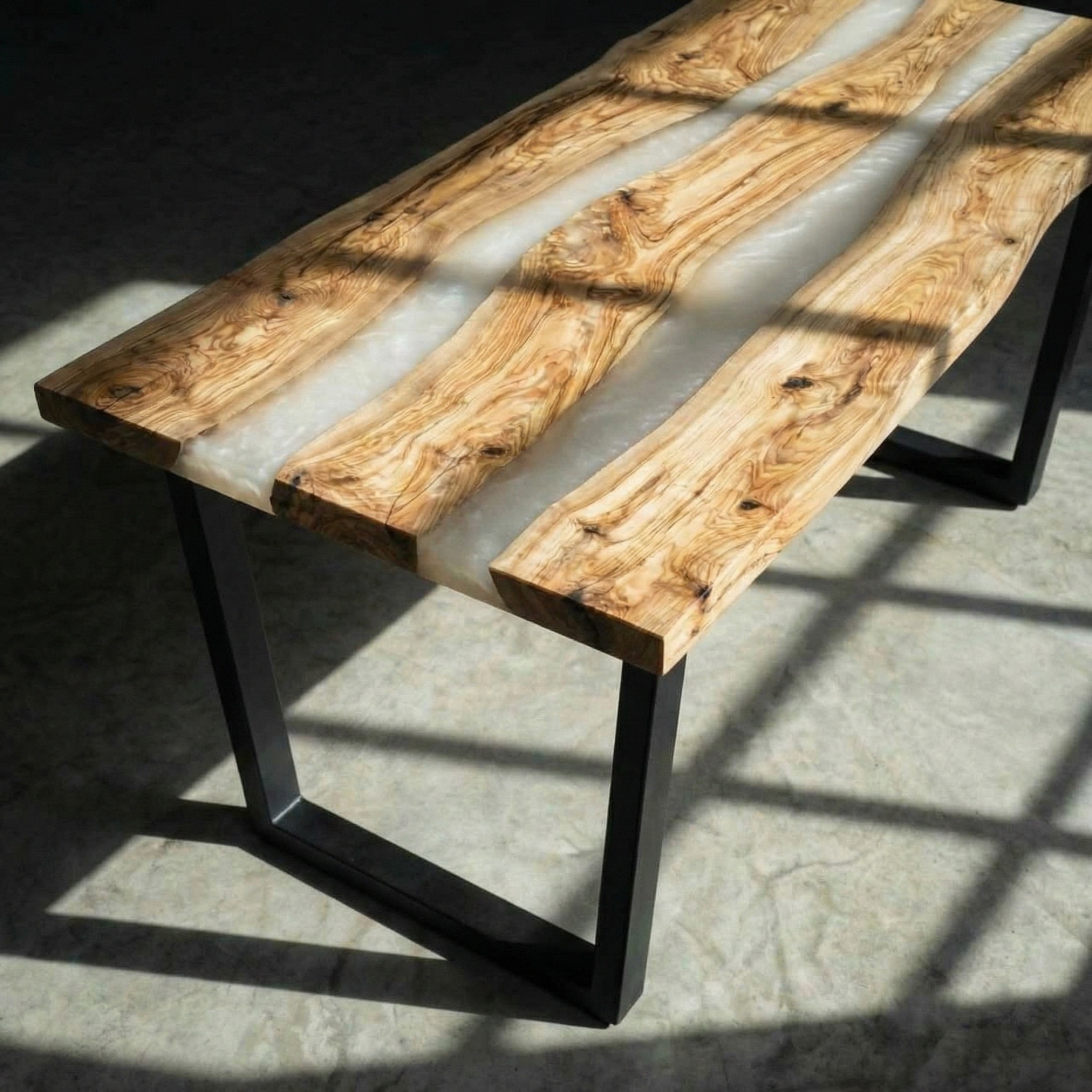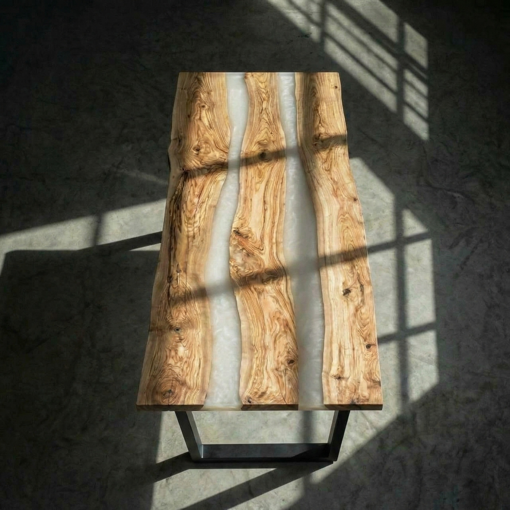Между слэбами - две реки из перламутровой молочной смолы. Она мягко светится, переливается на свету, оставаясь нежной, без резкого блеска. Молочная основа с перламутровым отливом соединяет деревянные фрагменты, создавая воздушные, струящиеся прослойки.