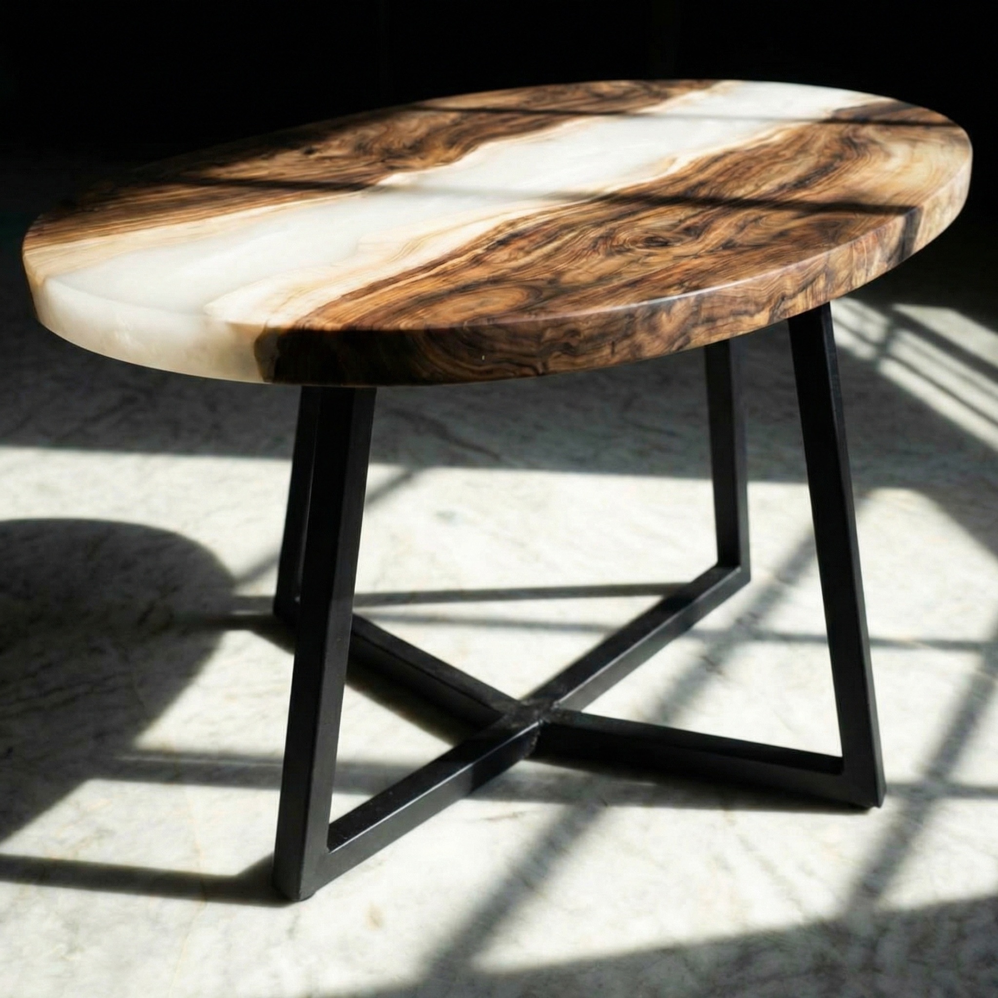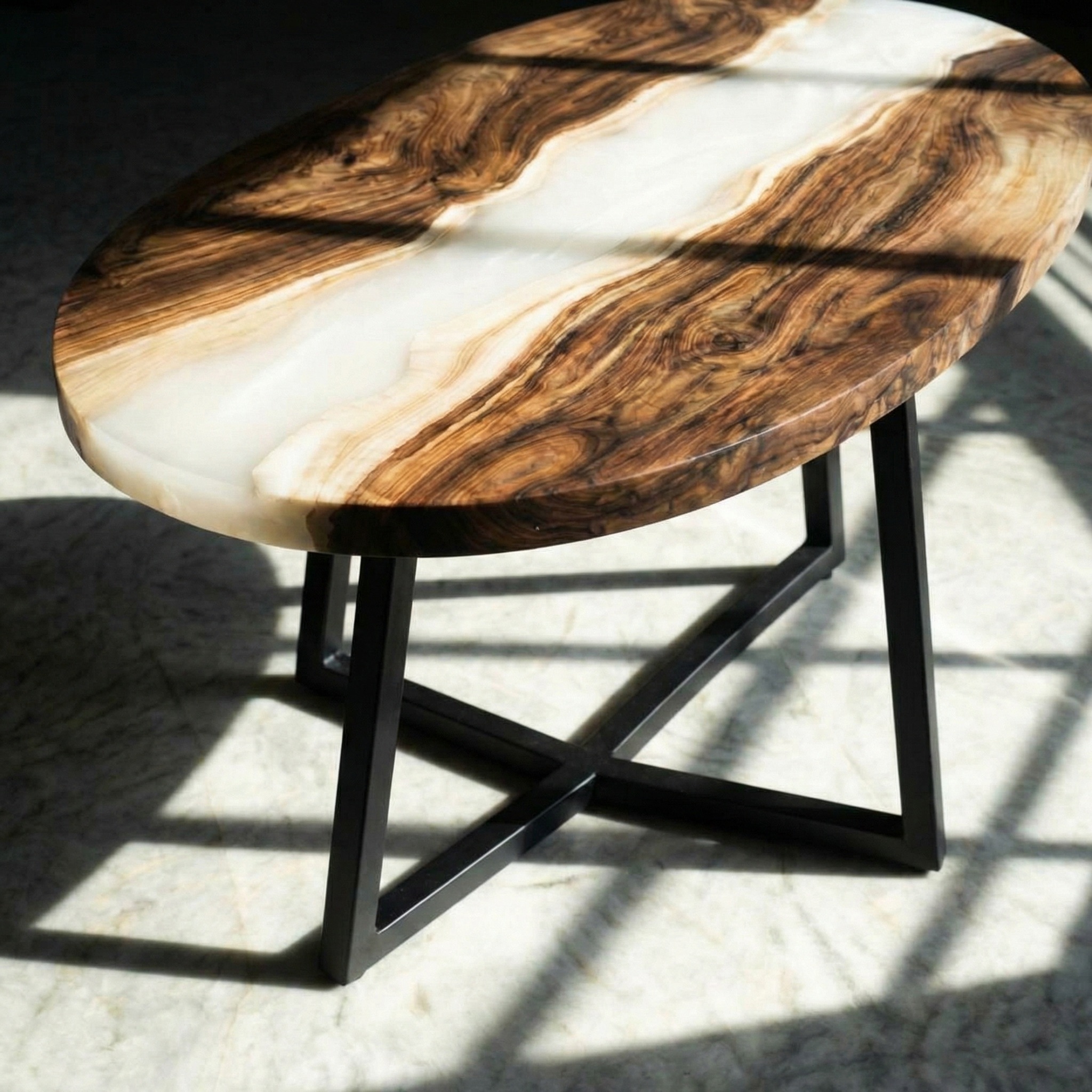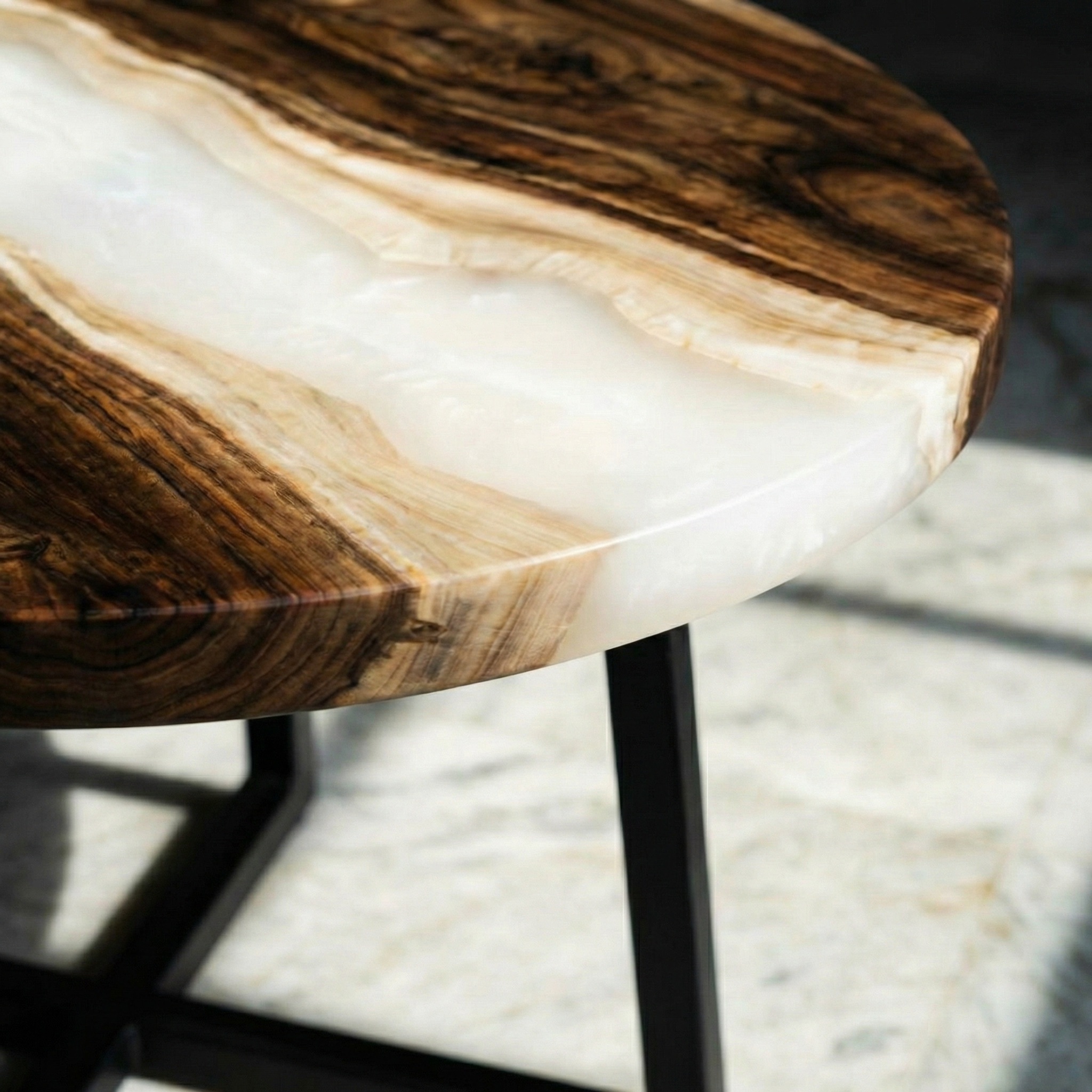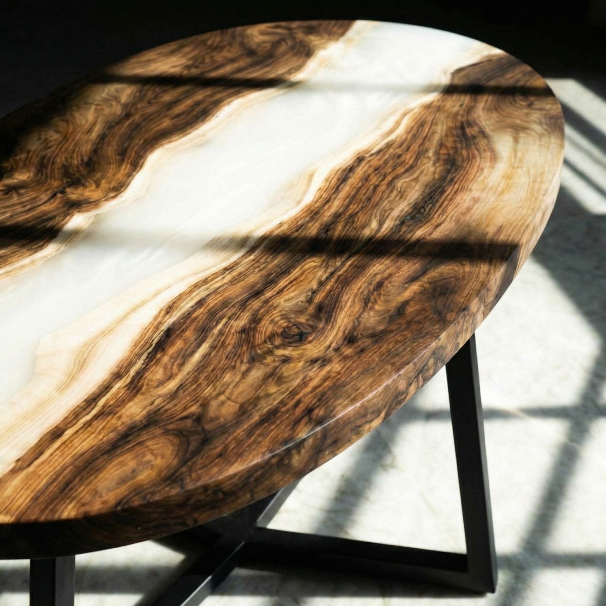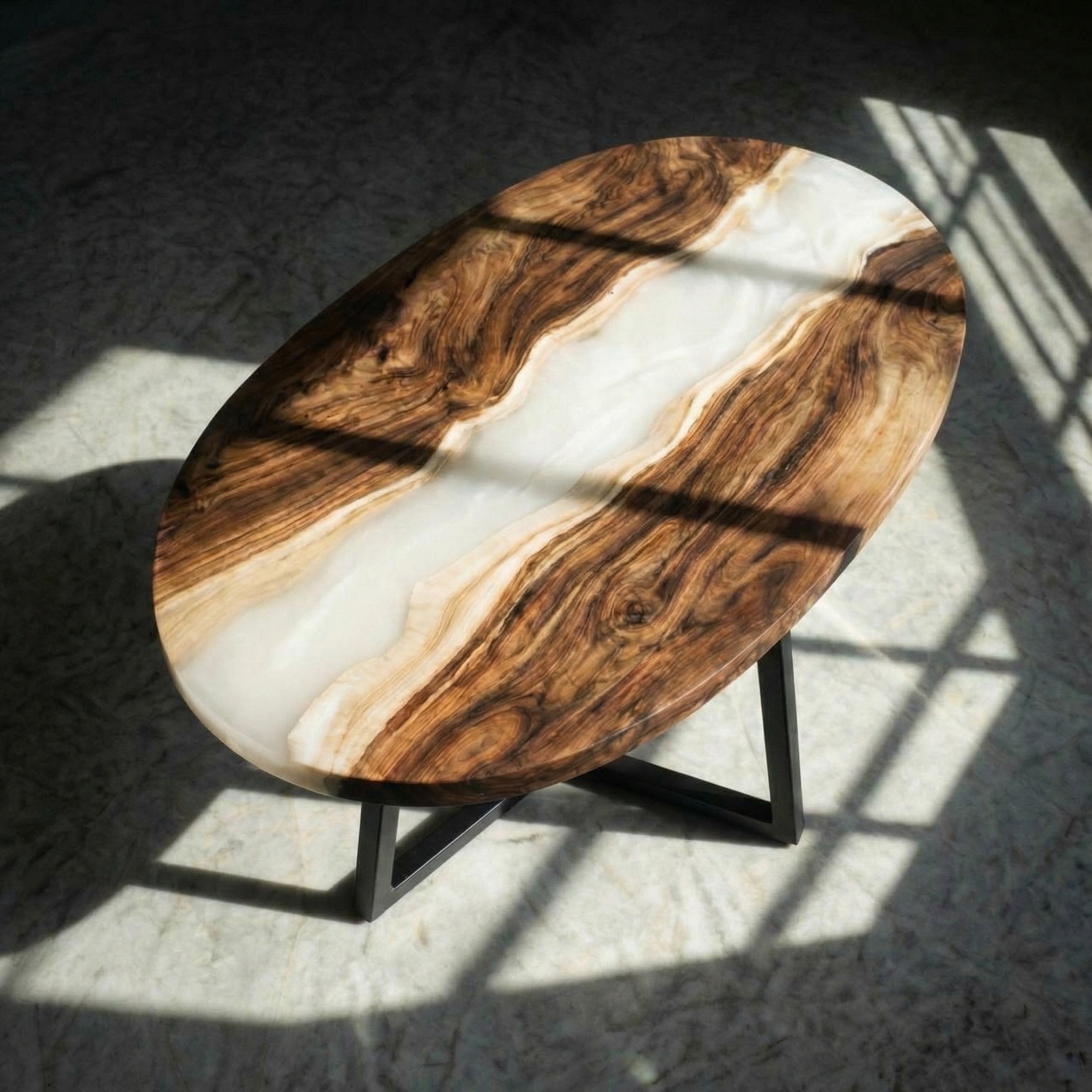 Перламутровая смола ложится между ними, как тихая вода. Она не блестит, а светится изнутри - молочным, тёплым, едва уловимым мерцанием. Под ней обзол становится глубже, рисунок дерева - объёмнее. Снаружи - ровный овал, спокойный и строгий, который держит эту внутреннюю живопись в идеальном равновесии.
