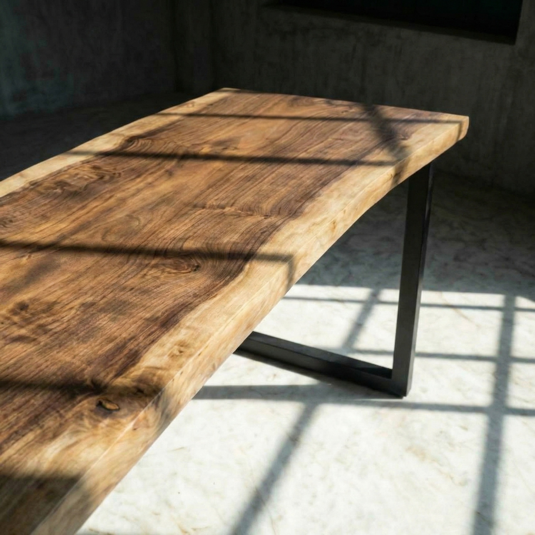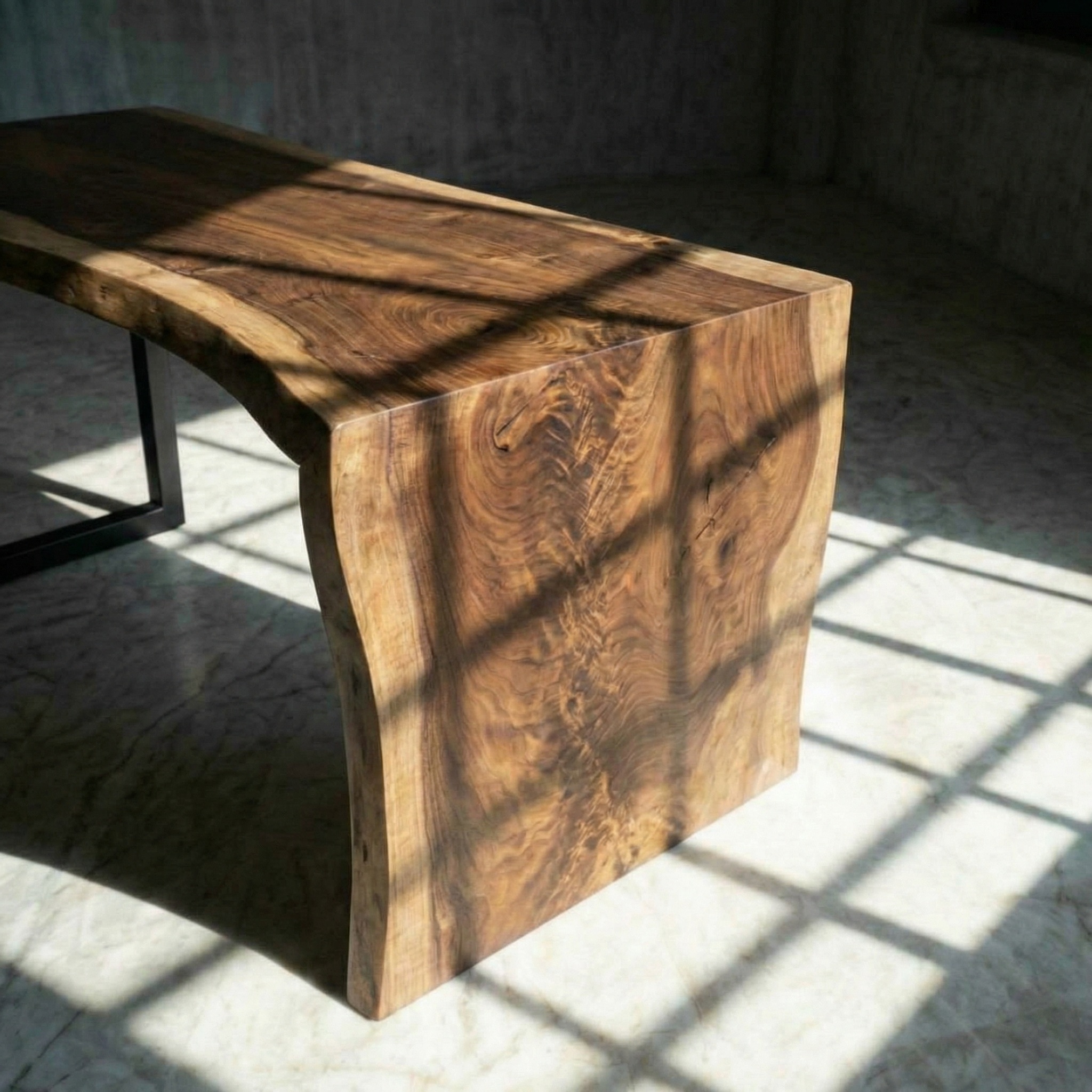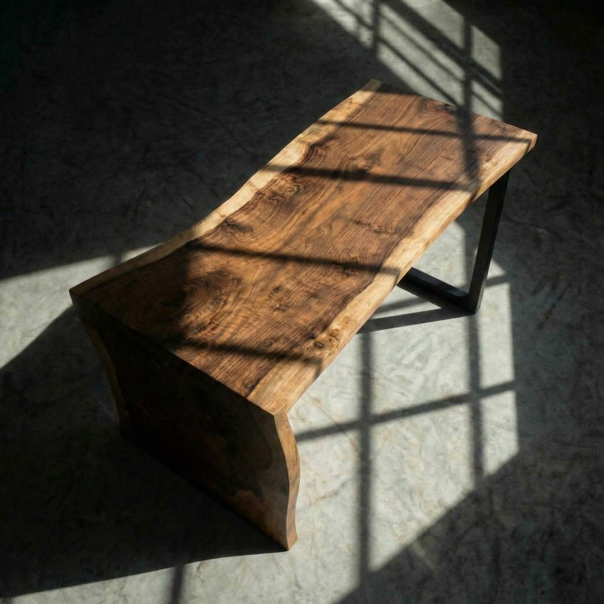 С одной стороны дерево плавно перетекает вниз, образуя единую опору-водопад. Горизонталь становится вертикалью без единого стыка. С другой - лаконичное металлическое подстолье, лёгкое и геометричное. Тёплое дерево встречается с холодным металлом, массивность - с воздушностью.