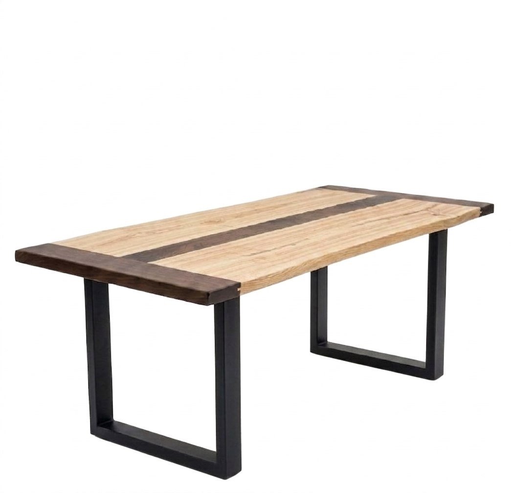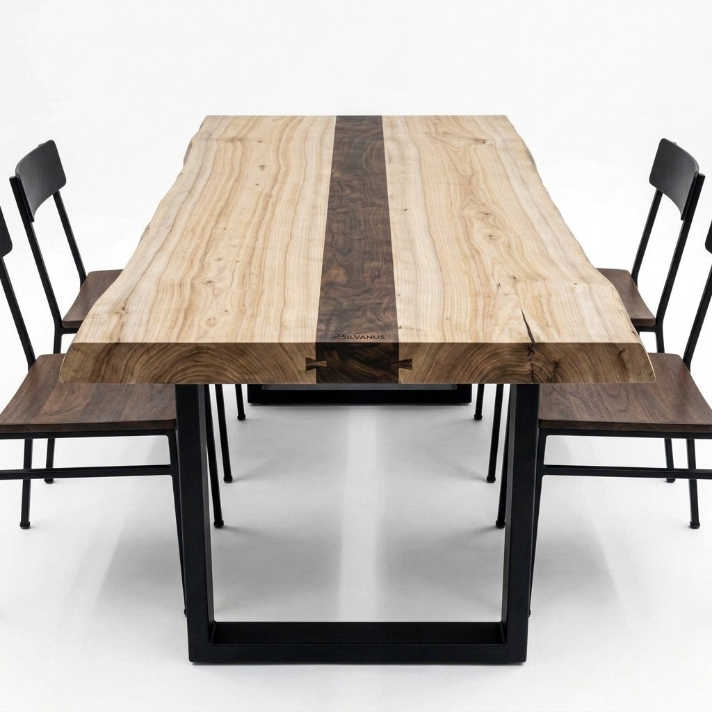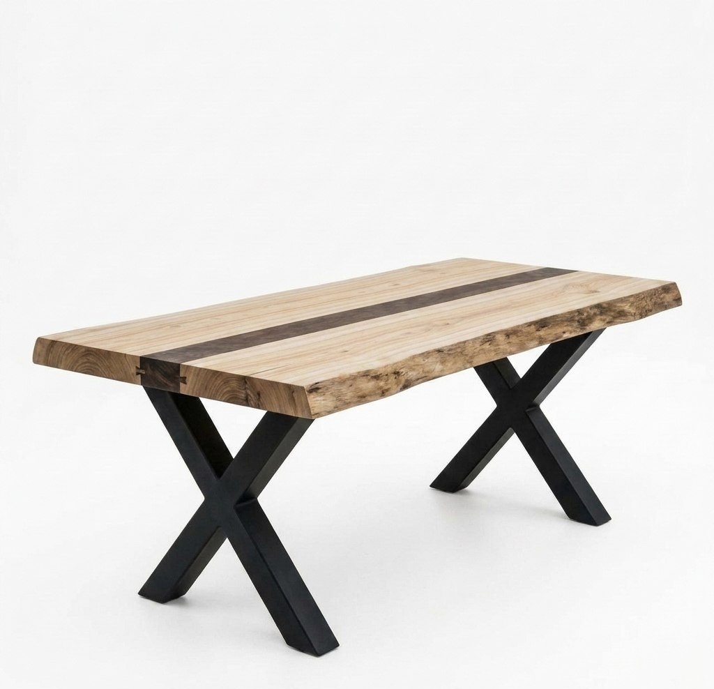 это уникальный арт-объект, рождённый из смелого союза двух благородных пород. Внутри светлого, графичного массива ясеня мы инкрустировали изящную полосу из ореха — тёмную, бархатистую, проведённую как росчерк через всю столешницу. Сочетание получилось завораживающим: глубокий тон ореха вступает в диалог с природными тёмно-коричневыми прожилками ясеня, которые удивительным образом напоминают окрас африканской зебры. Этот контрастный, почти анималистический узор мгновенно притягивает взгляд, делая стол абсолютным центром интерьера — предметом, который хочется разглядывать, касаться и показывать гостям.