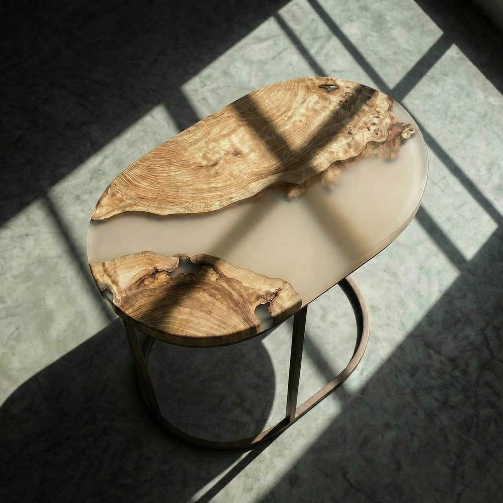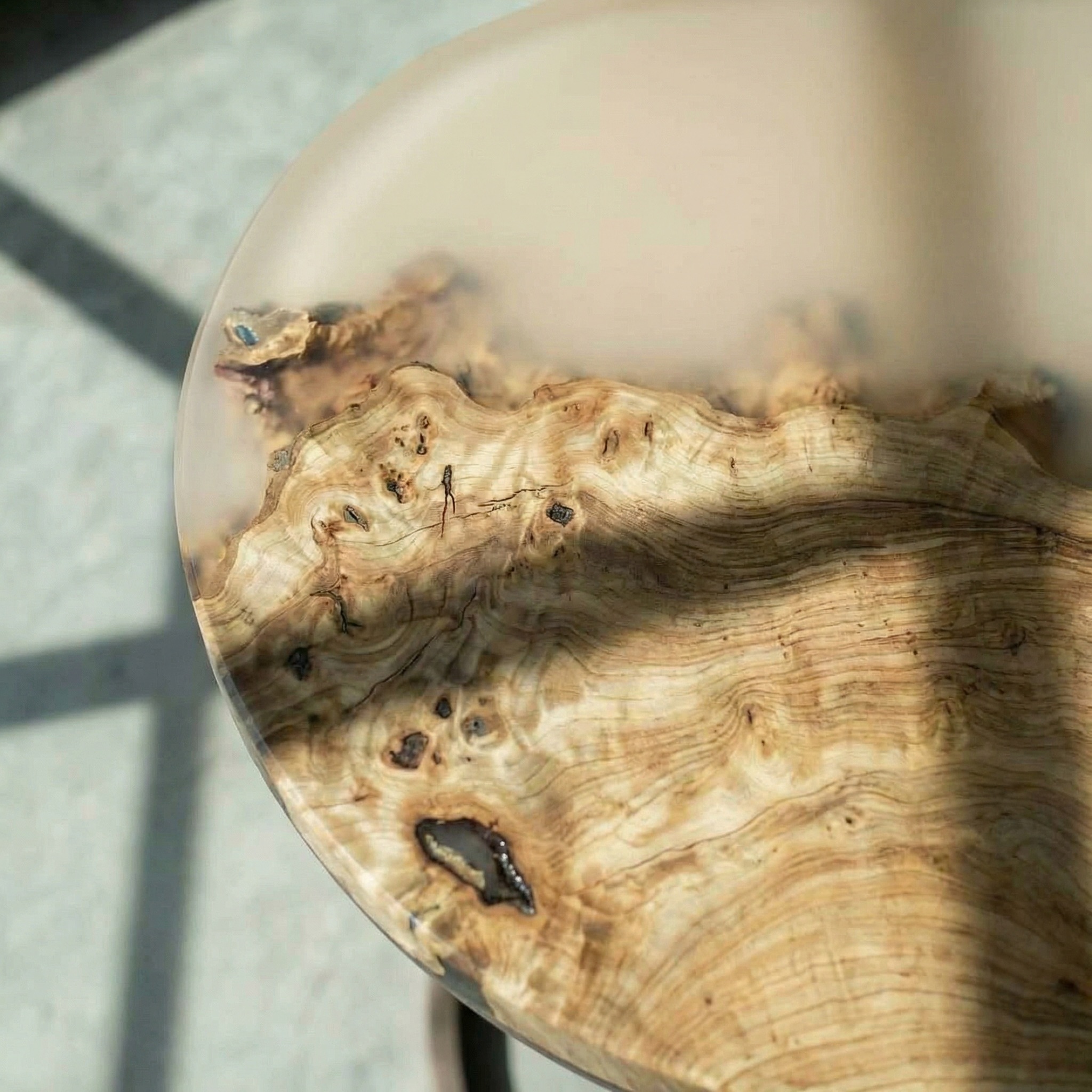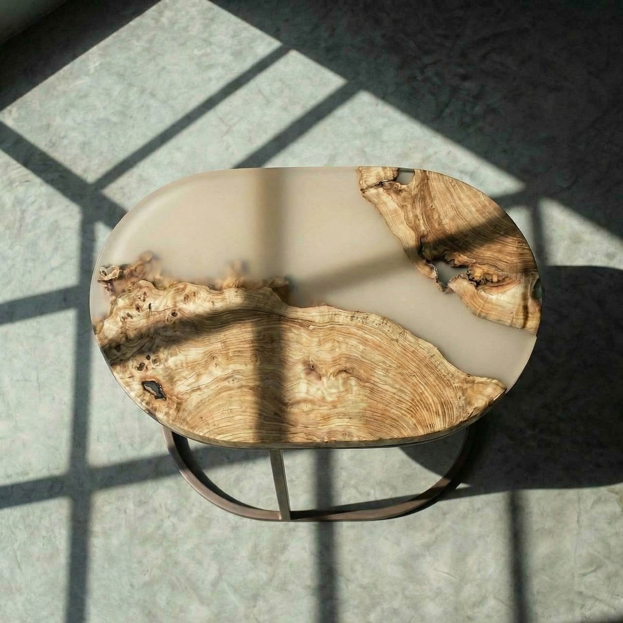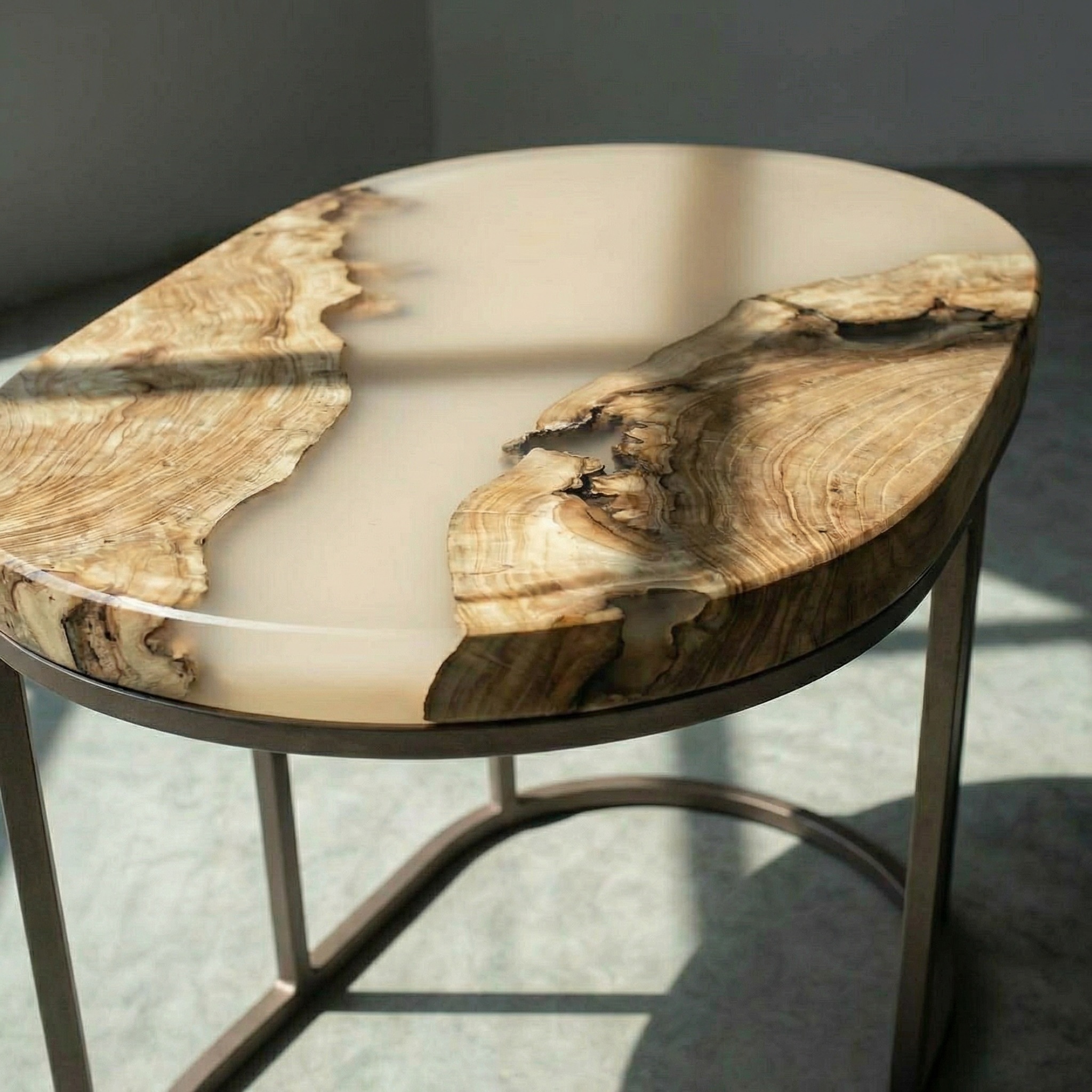 Матовая бежевая смола соединяет и дополняет их. Её бархатистая поверхность контрастирует с более рельефным деревом, приглашая прикоснуться.