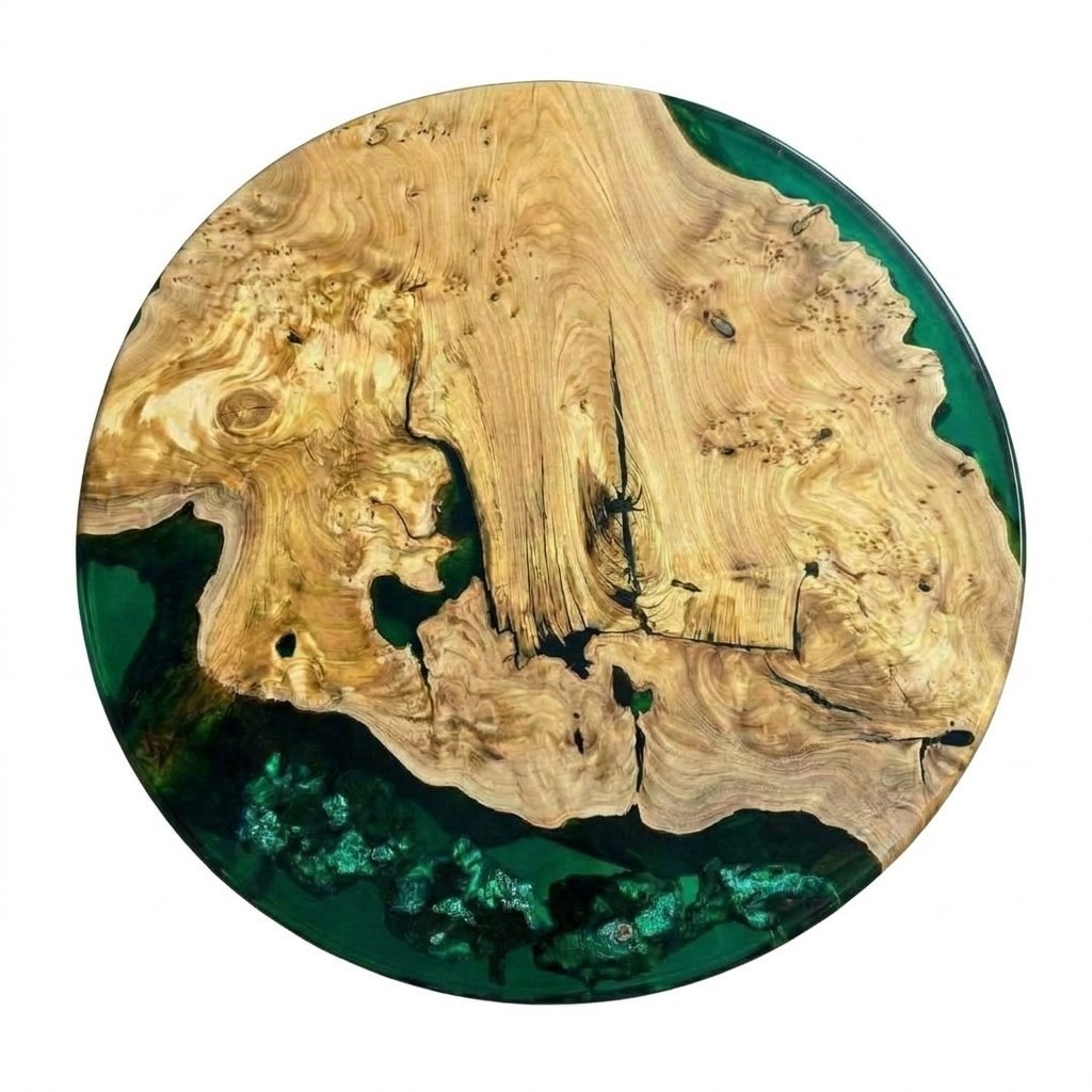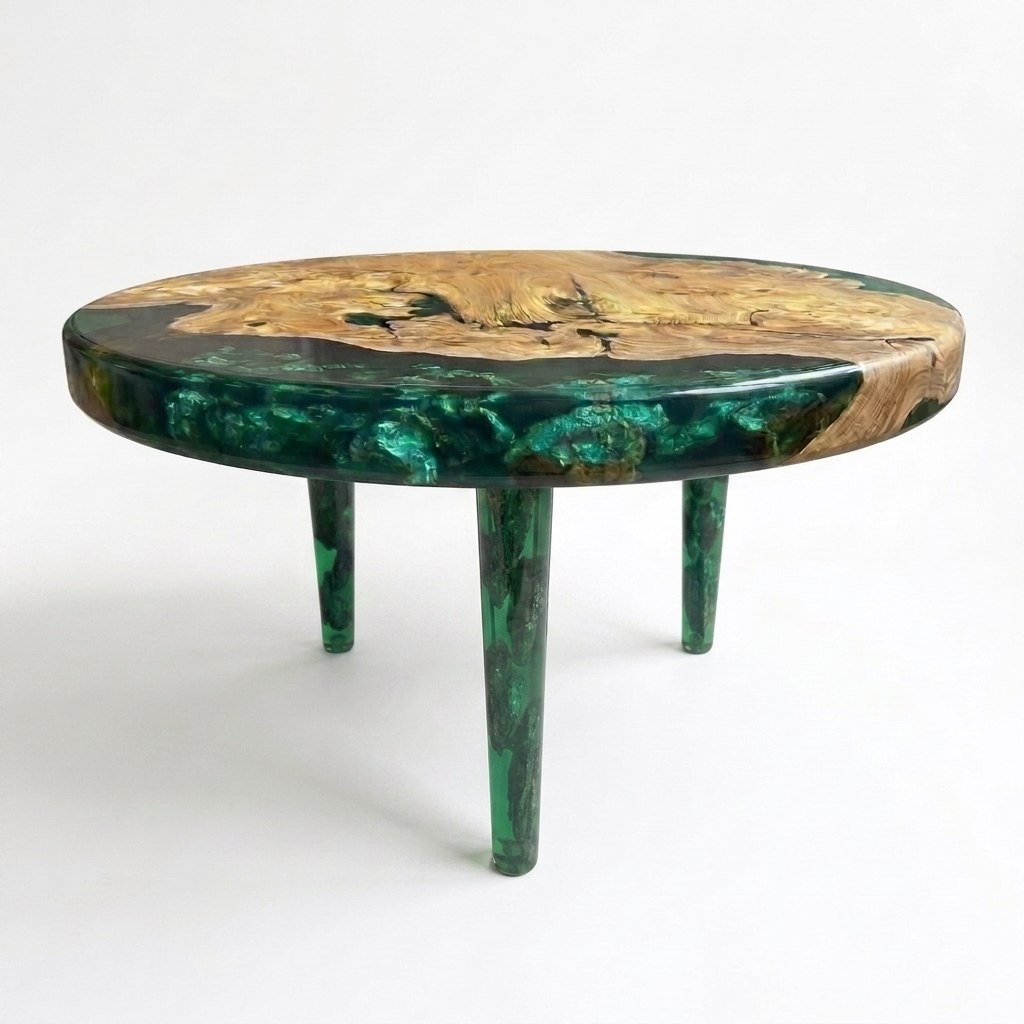 Круглый журнальный столик, где слэб карагача остаётся в своей подлинной форме, а всё остальное пространство диаметра заполнено изумрудной эпоксидной смолой. Внутри неё, как драгоценные включения, залиты фрагменты коры — они парят в прозрачной глубине, создавая эффект застывшего мгновения. Смола не спорит с деревом, а огибает его неровный край, подчёркивая естественную пластику массива и собирая композицию в идеальный круг. Изумрудный тон добавляет свежести и благородства: столик выглядит одновременно природно и драгоценно.