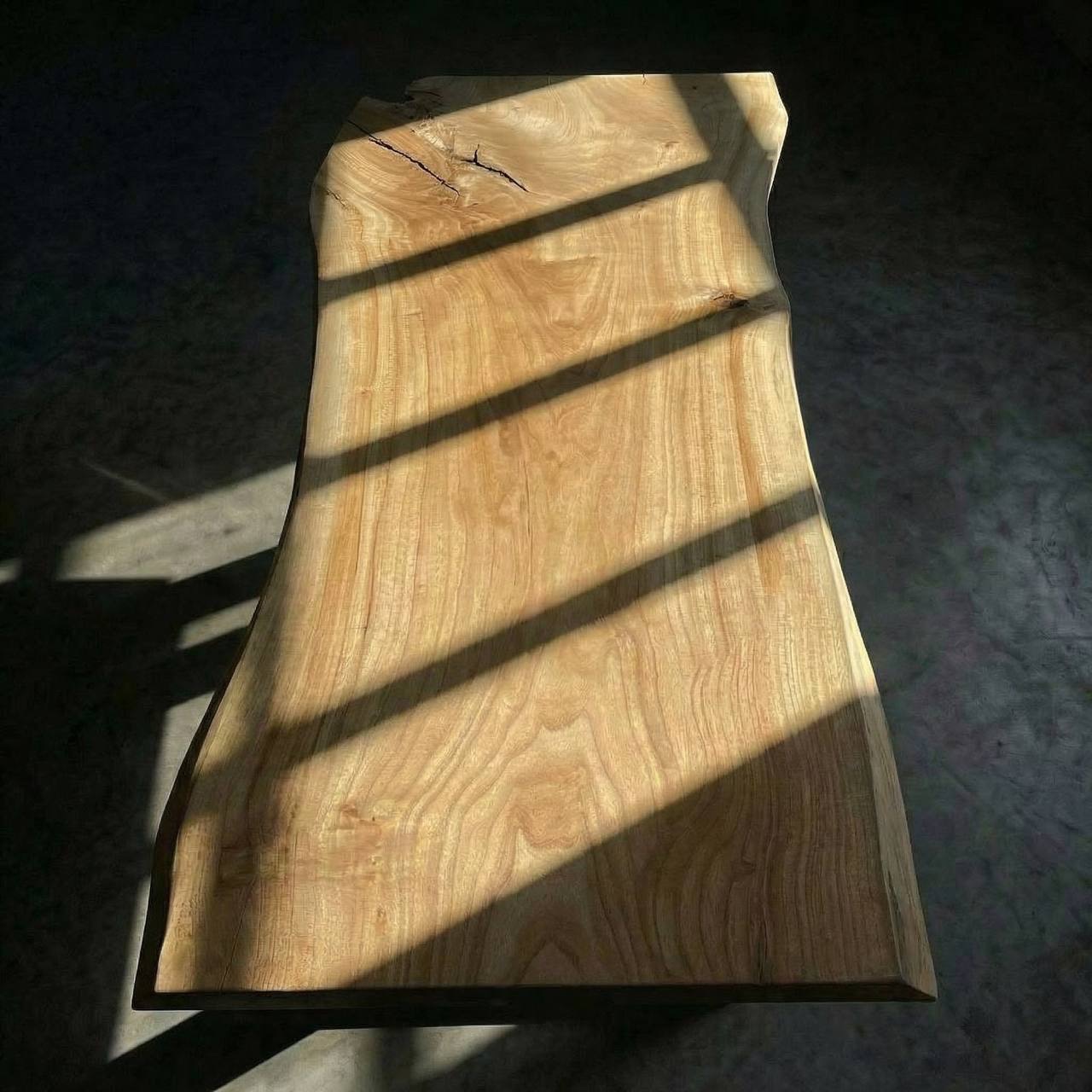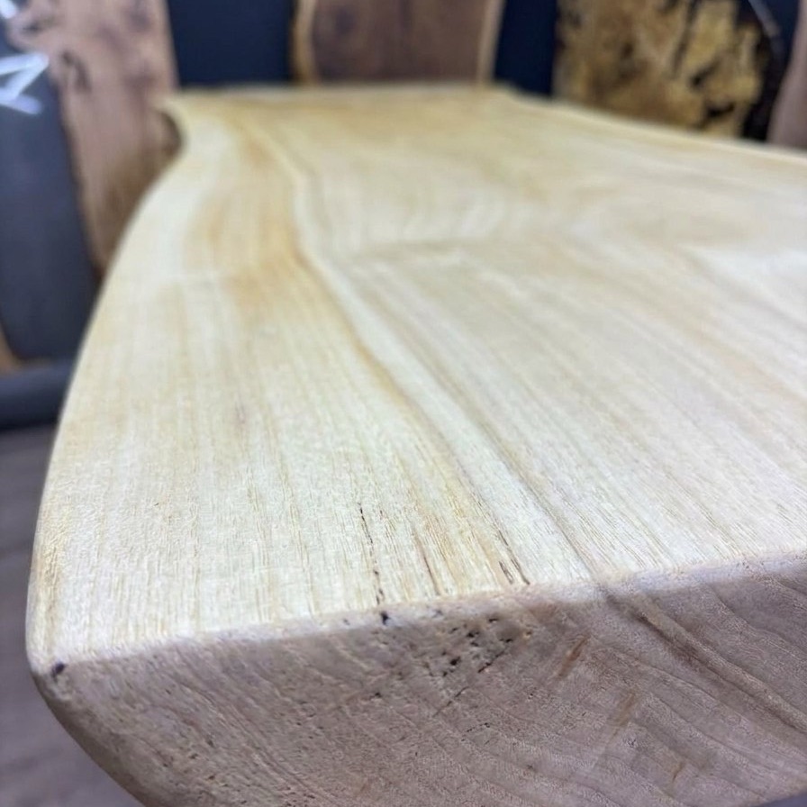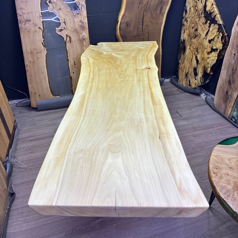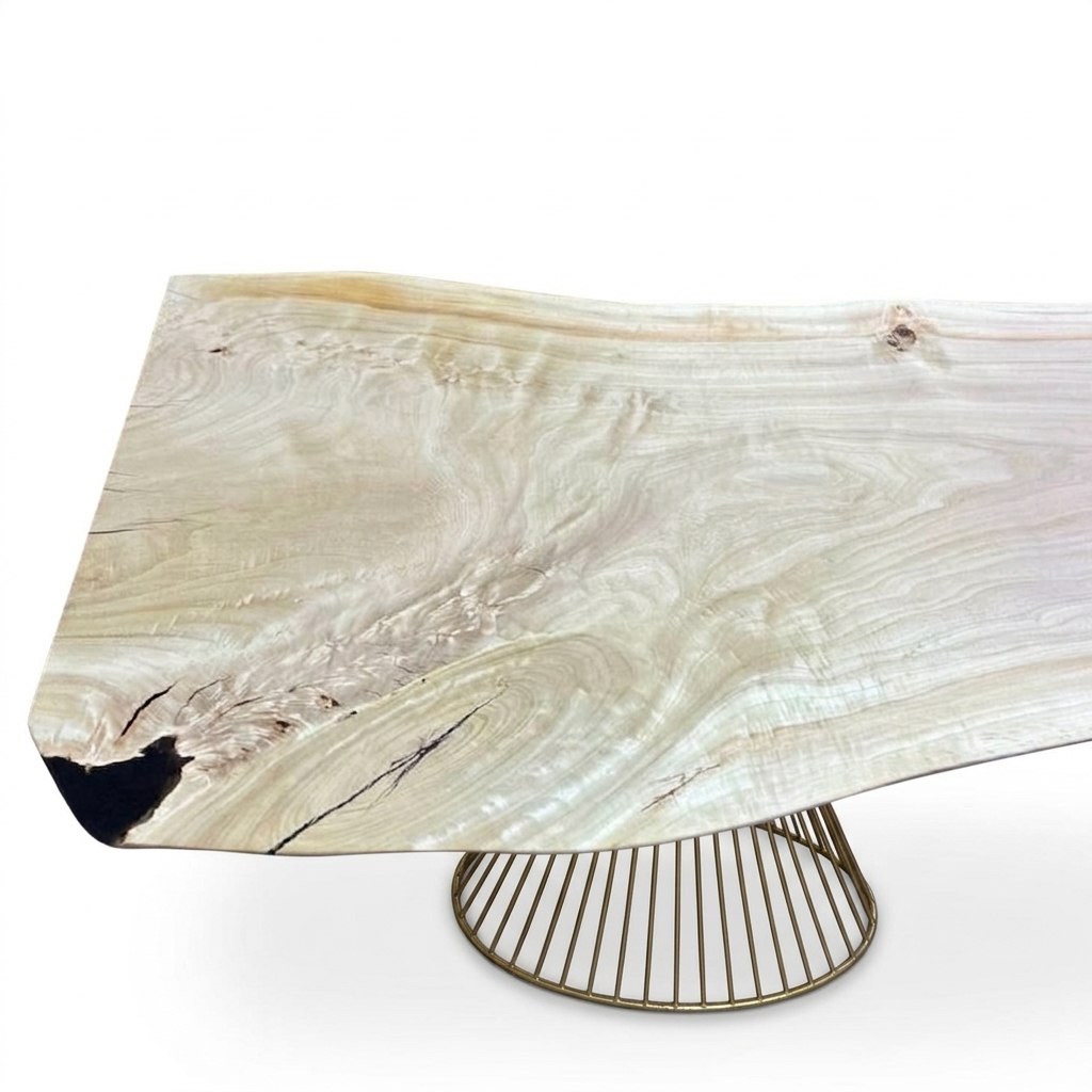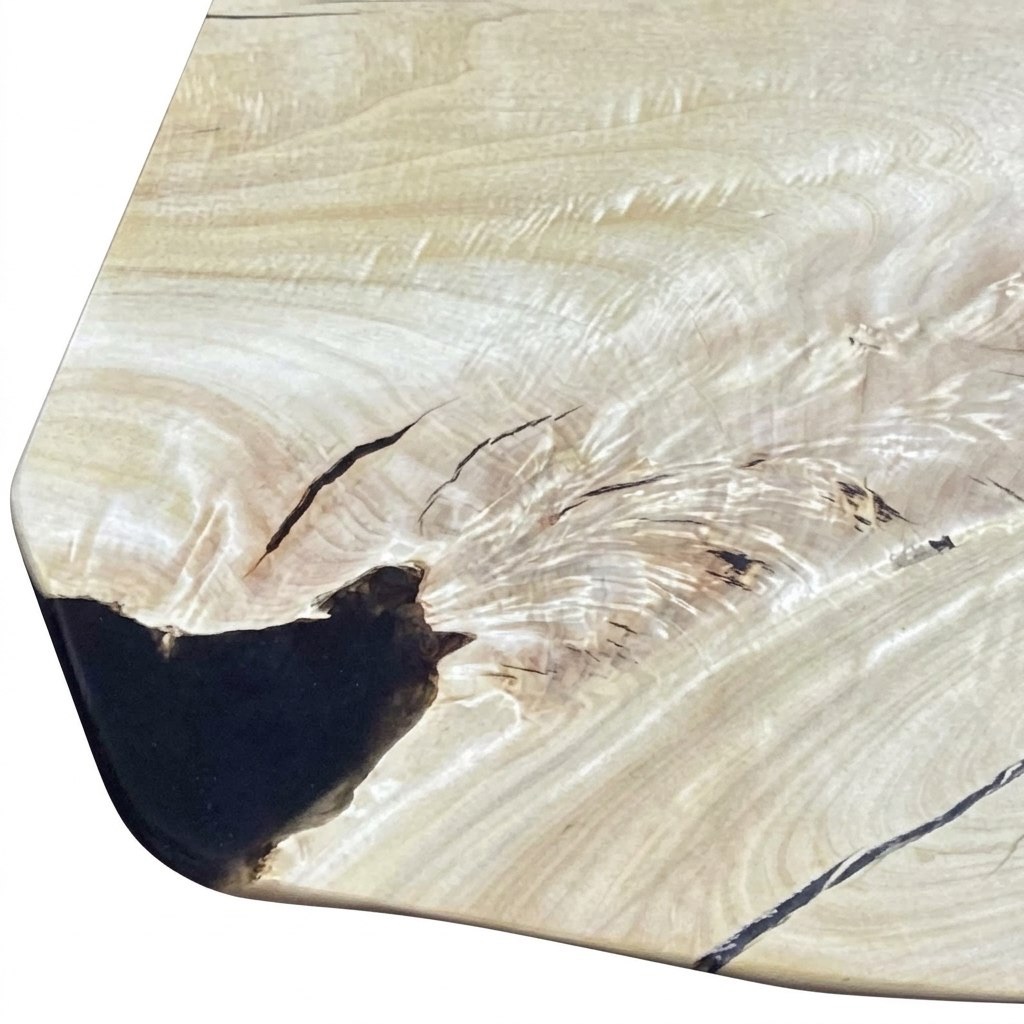 Цельный массивный слэб горного тополя с уникальным рисунком свилеватой структуры: волокна переплетаются в причудливый узор, переливаясь на свету всеми оттенками мёда и золота.