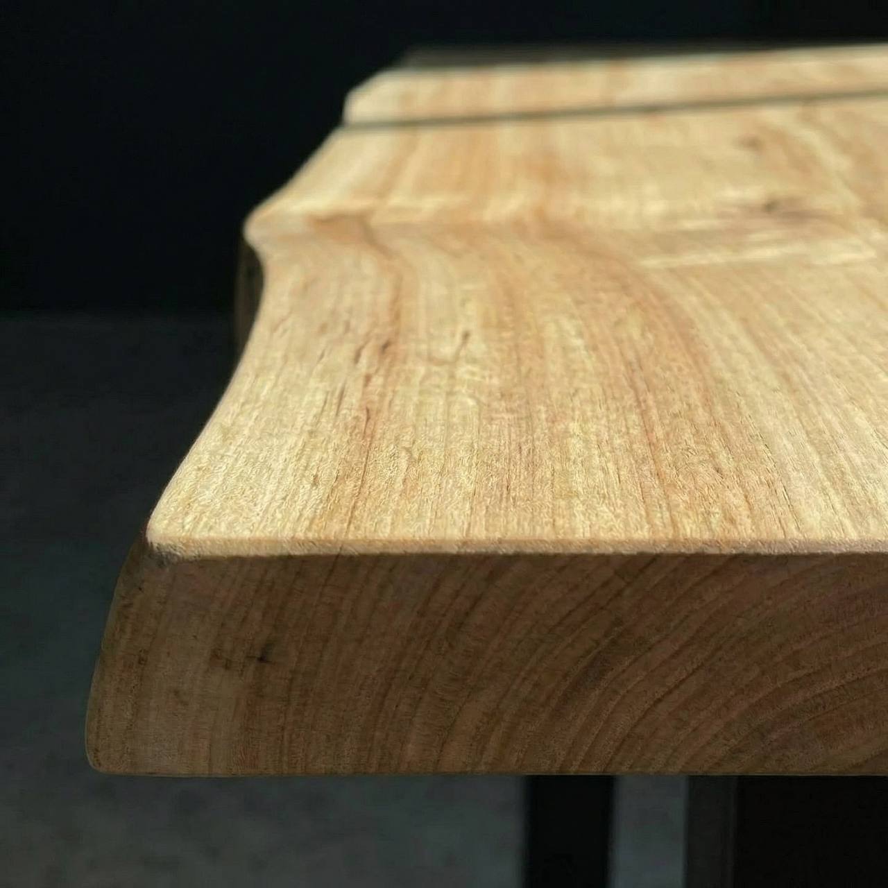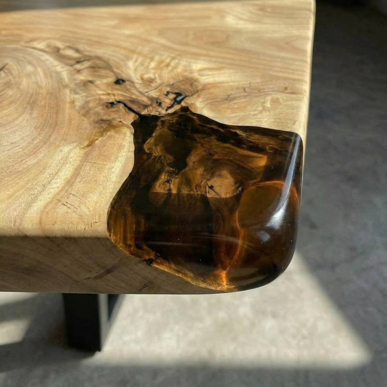 Один угол залит эпоксидной смолой, что создает современный акцент. Столешница двухсторонняя: одна сторона немного более светлая, другая сторона покрыта более темным маслом, также можно тонировать еще темнее. Подстолье на ваш выбор.